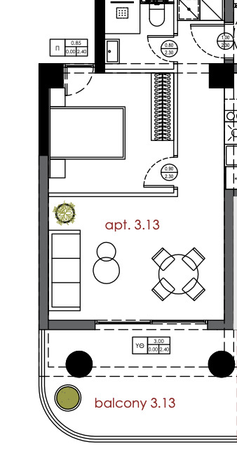 Die Wohnung besteht aus einem Schlafzimmer, einem offenen Wohn- und Küchenbereich (Wohnküche), einem Badezimmer und einem komfortablen Balkon. Ähnliche Wohnungen in Größe und Preis sind auf allen Etagen vom 1. bis zum 8. Stock verfügbar.