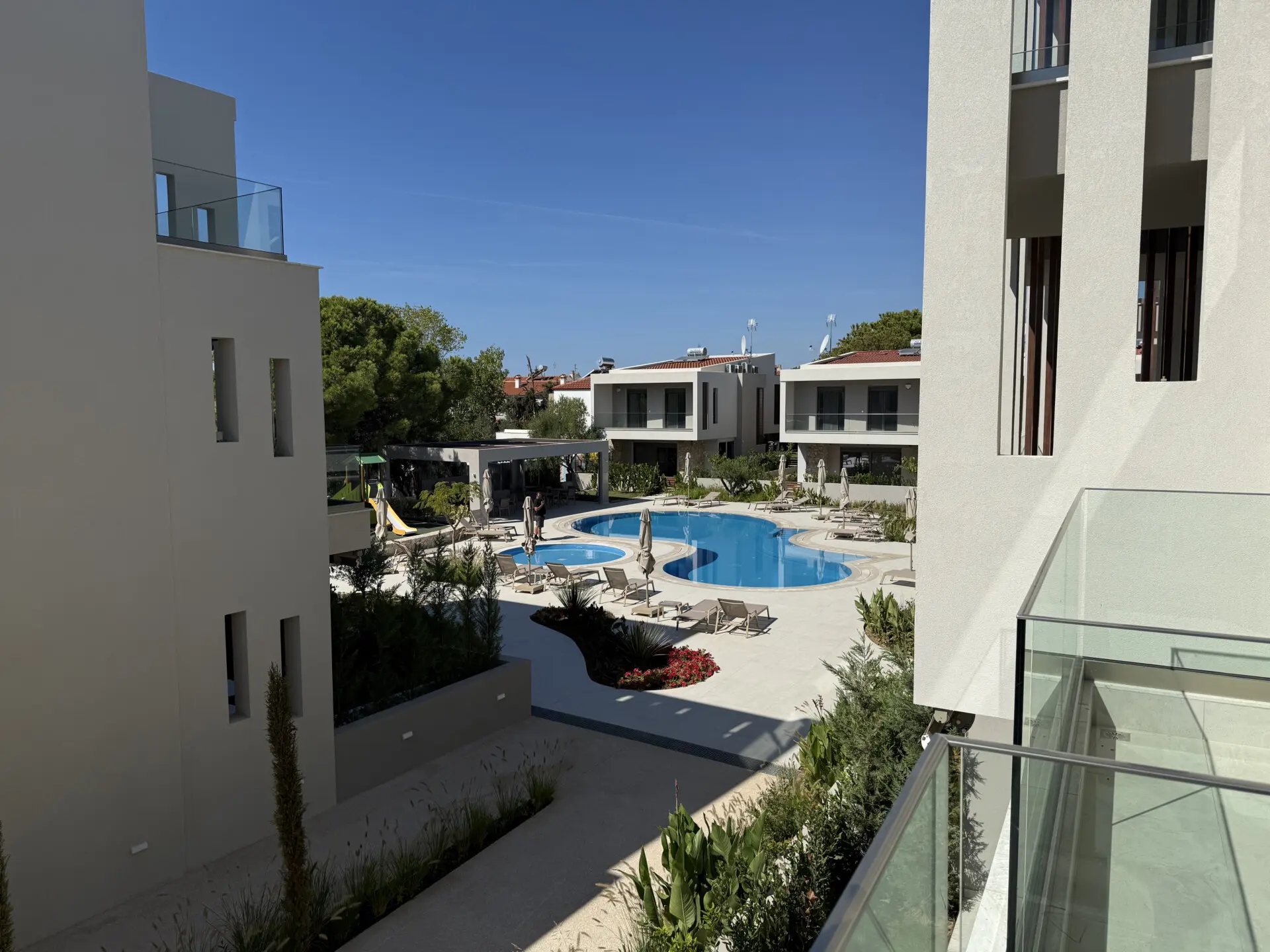 Die Wohnanlage bietet viele Annehmlichkeiten, darunter einen Swimmingpool, einen Kinderspielplatz und Hausmeisterdienste. Jedes Zimmer ist mit Klimaanlage ausgestattet, und die Wohnung umfasst Küchen- und Badezimmermöbel. Moderne Technologien gewährleisten ein hohes Maß an Komfort, darunter ein „Smart Home“-System, eine Alarmanlage, elektrische Rollläden, doppelt verglaste Aluminiumfenster und Moskitonetze.
