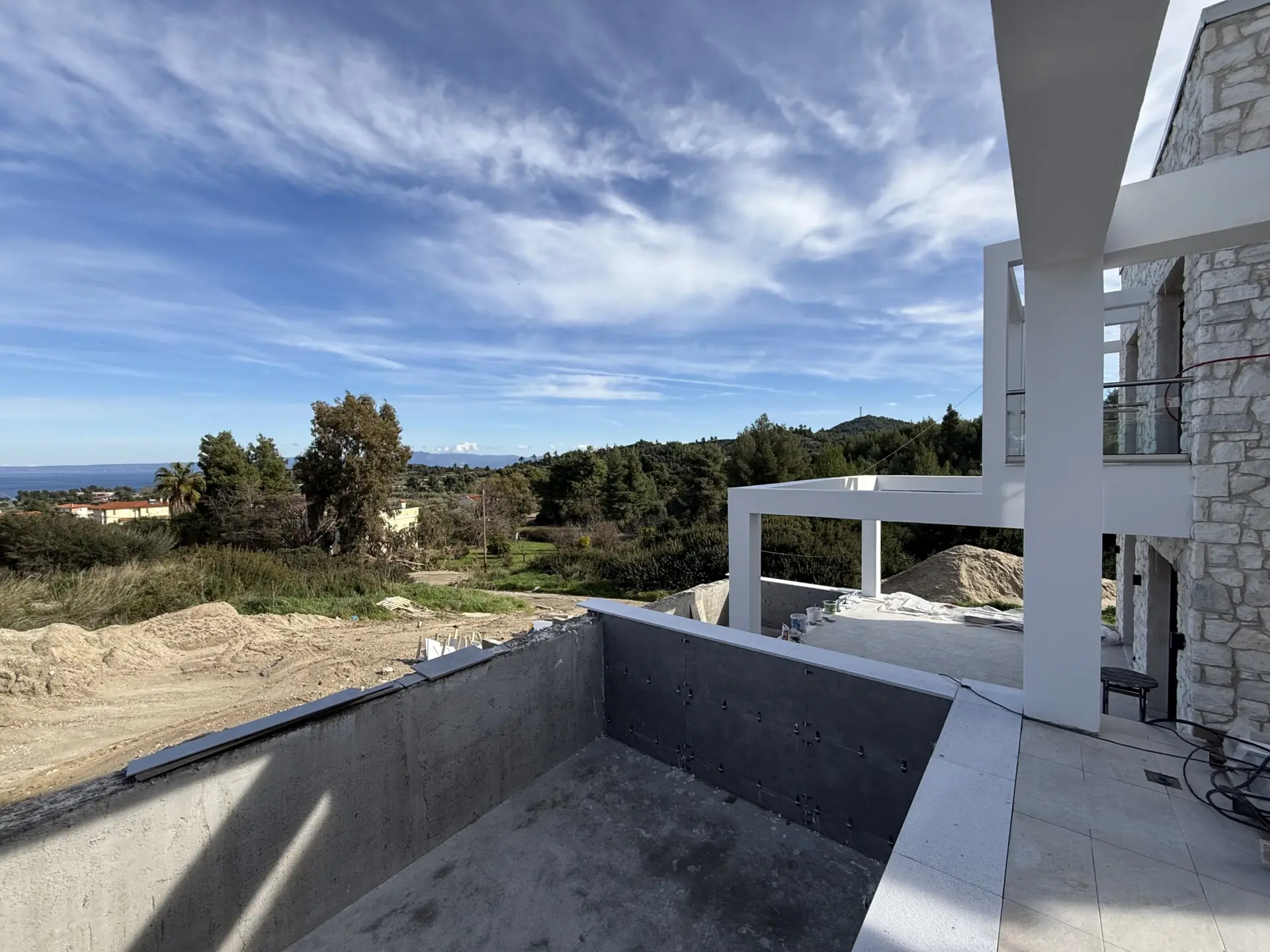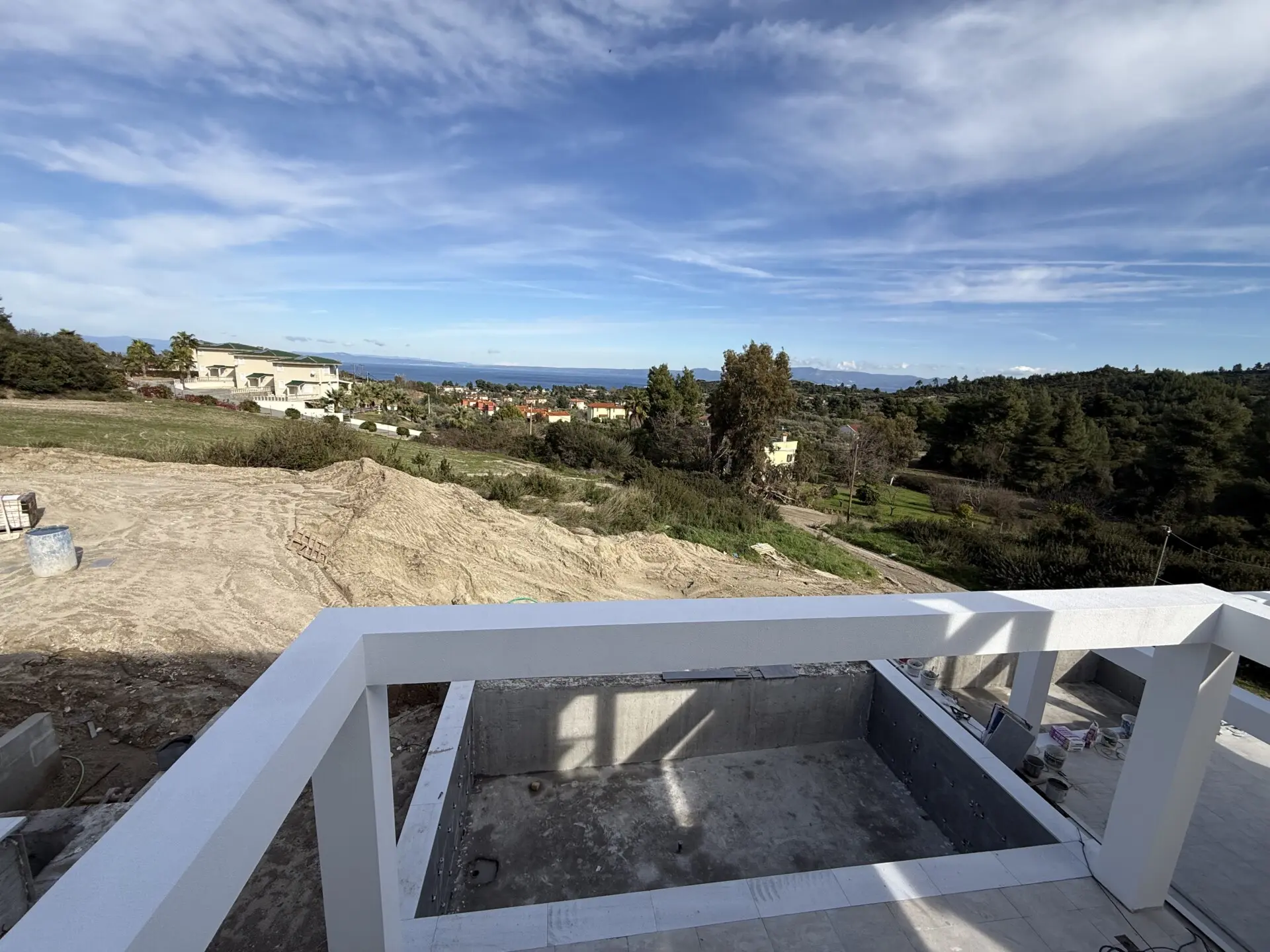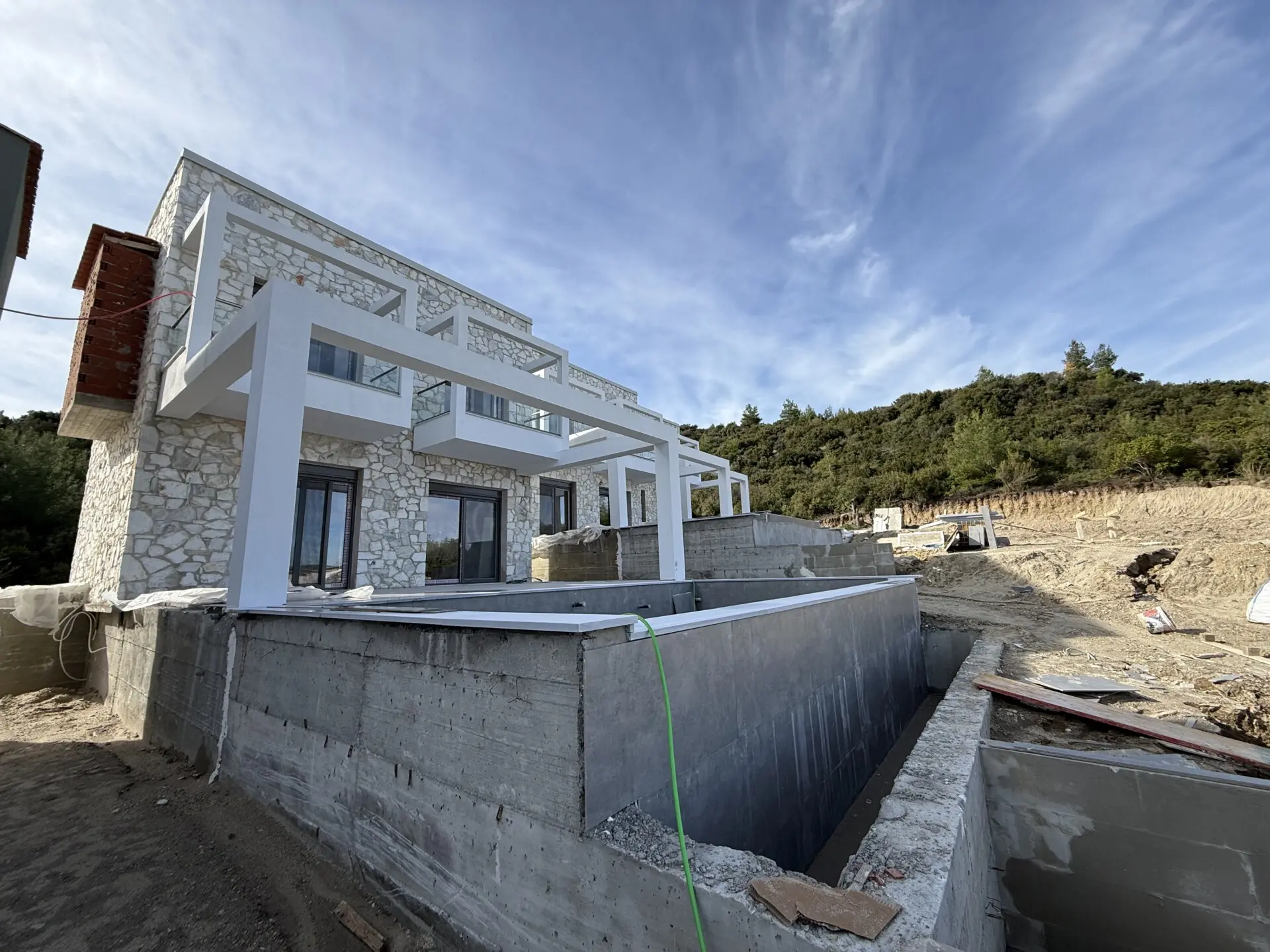 Hanioti – Kassandra (Chalkidiki). Zum Verkauf steht eine neu gebaute Villa auf drei Ebenen mit einer Gesamtfläche von 150 m², auf einem Grundstück von 400 m², in der schönen und ruhigen Gegend von Hanioti. Baujahr 2026. Die Immobilie besteht aus 5 Schlafzimmern, einer Küche, einem großzügigen Wohnzimmer, 3 Badezimmern und einem Abstellraum. Sie bietet einen herrlichen Blick auf das Meer und den Wald und garantiert Komfort und Privatsphäre. Zur Ausstattung gehören 6 Klimaanlagen, Heizungsinstallation, große Terrassen, Aluminiumfenster mit Doppelverglasung, Fliesenböden, Sicherheitstür, Einbauschränke, Innentreppe, BBQ, Satellitenantenne, Parkplatz für 2 Fahrzeuge sowie ein privater Swimmingpool. Die Entfernung zum Meer beträgt ca. 1.000 Meter, zum Flughafen Thessaloniki ca. 90 km.