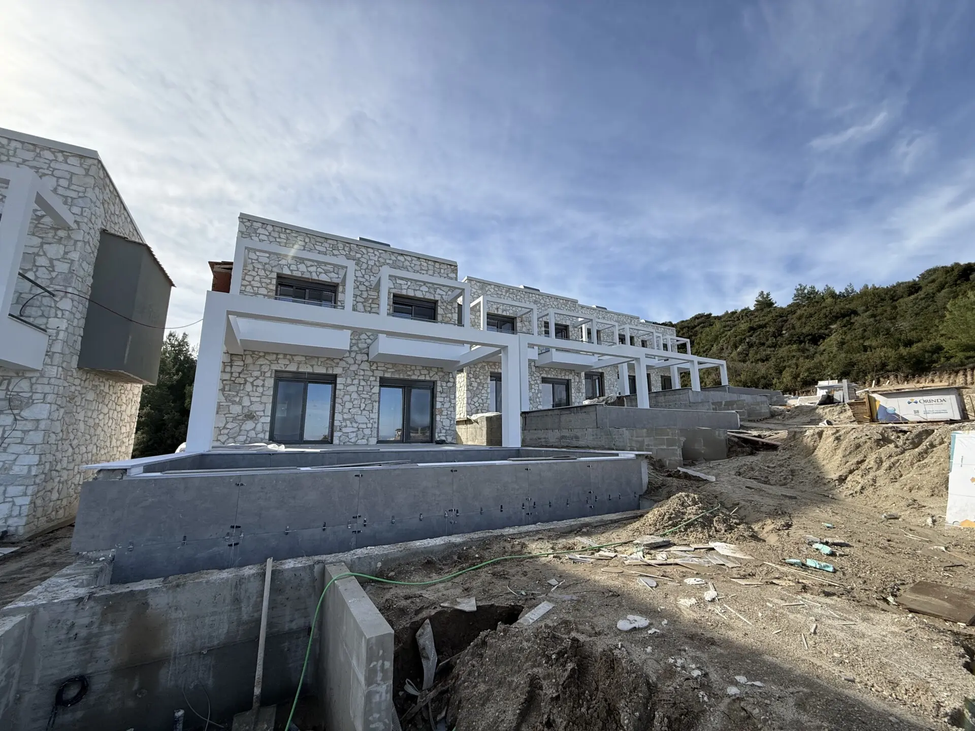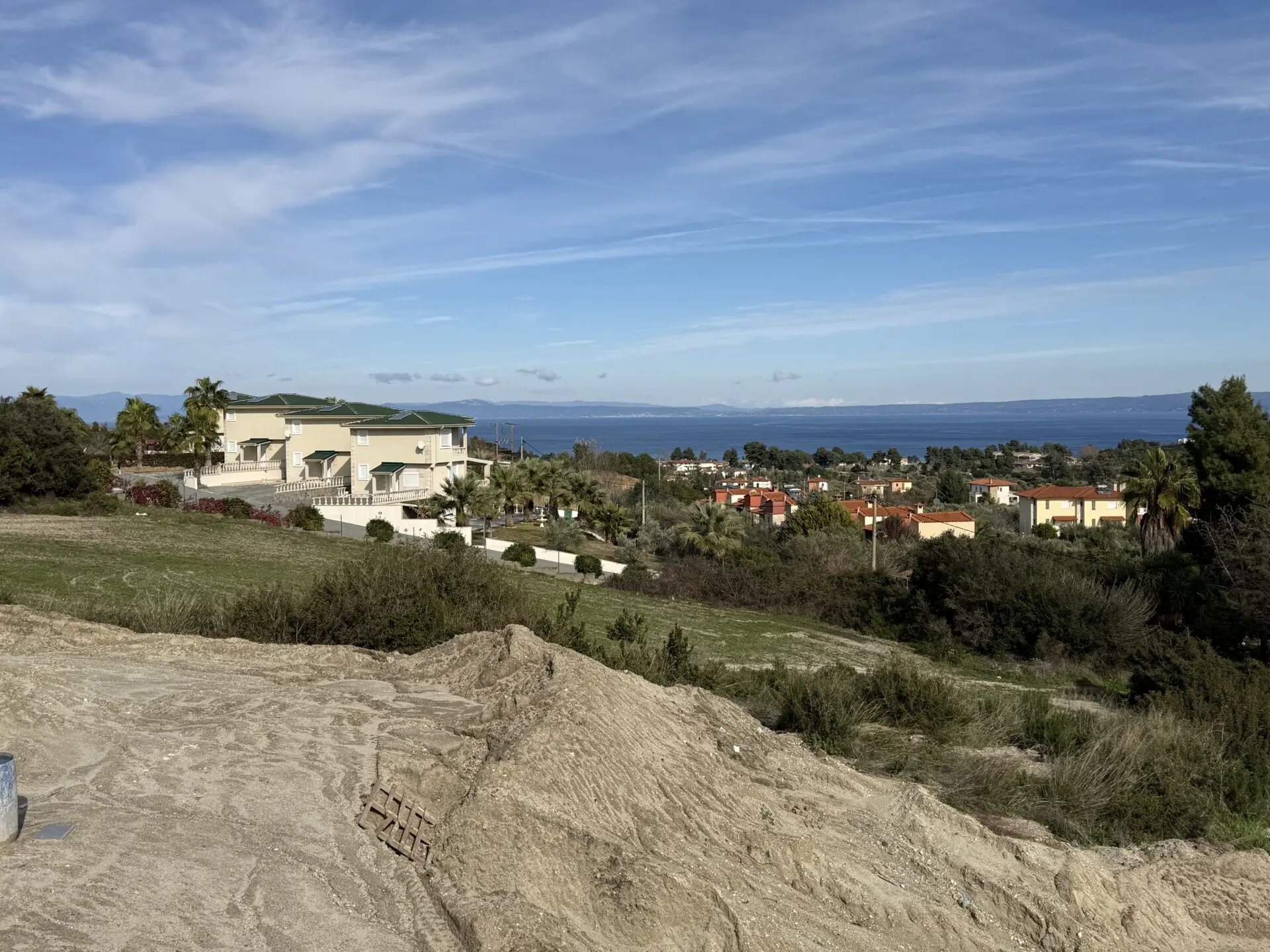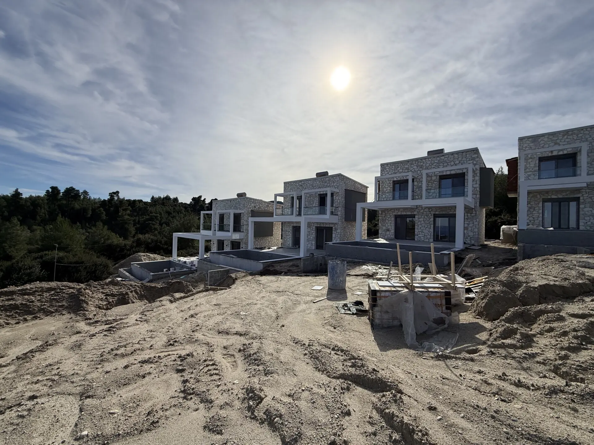 Hanioti – Kassandra (Chalkidiki). Zum Verkauf steht eine neu gebaute Villa auf drei Ebenen mit einer Gesamtfläche von 150 m², auf einem Grundstück von 400 m², in der schönen und ruhigen Gegend von Hanioti. Baujahr 2026. Die Immobilie besteht aus 5 Schlafzimmern, einer Küche, einem großzügigen Wohnzimmer, 3 Badezimmern und einem Abstellraum. Sie bietet einen herrlichen Blick auf das Meer und den Wald und garantiert Komfort und Privatsphäre. Zur Ausstattung gehören 6 Klimaanlagen, Heizungsinstallation, große Terrassen, Aluminiumfenster mit Doppelverglasung, Fliesenböden, Sicherheitstür, Einbauschränke, Innentreppe, BBQ, Satellitenantenne, Parkplatz für 2 Fahrzeuge sowie ein privater Swimmingpool. Die Entfernung zum Meer beträgt ca. 1.000 Meter, zum Flughafen Thessaloniki ca. 90 km.