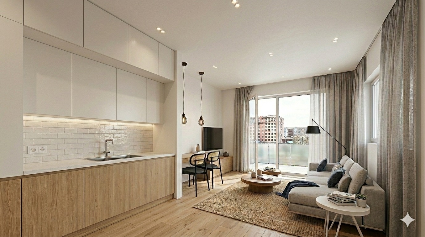 Das Studio bietet eine Gesamtfläche von etwa 40 m² und verfügt über einen offenen Wohnbereich mit Küche und Schlafbereich, einem Badezimmer und direktem Zugang zu einem Balkon, was natürliches Licht und eine komfortable Wohnumgebung bietet und es sowohl für Privatwohnungen als auch für Investitionen ideal macht.