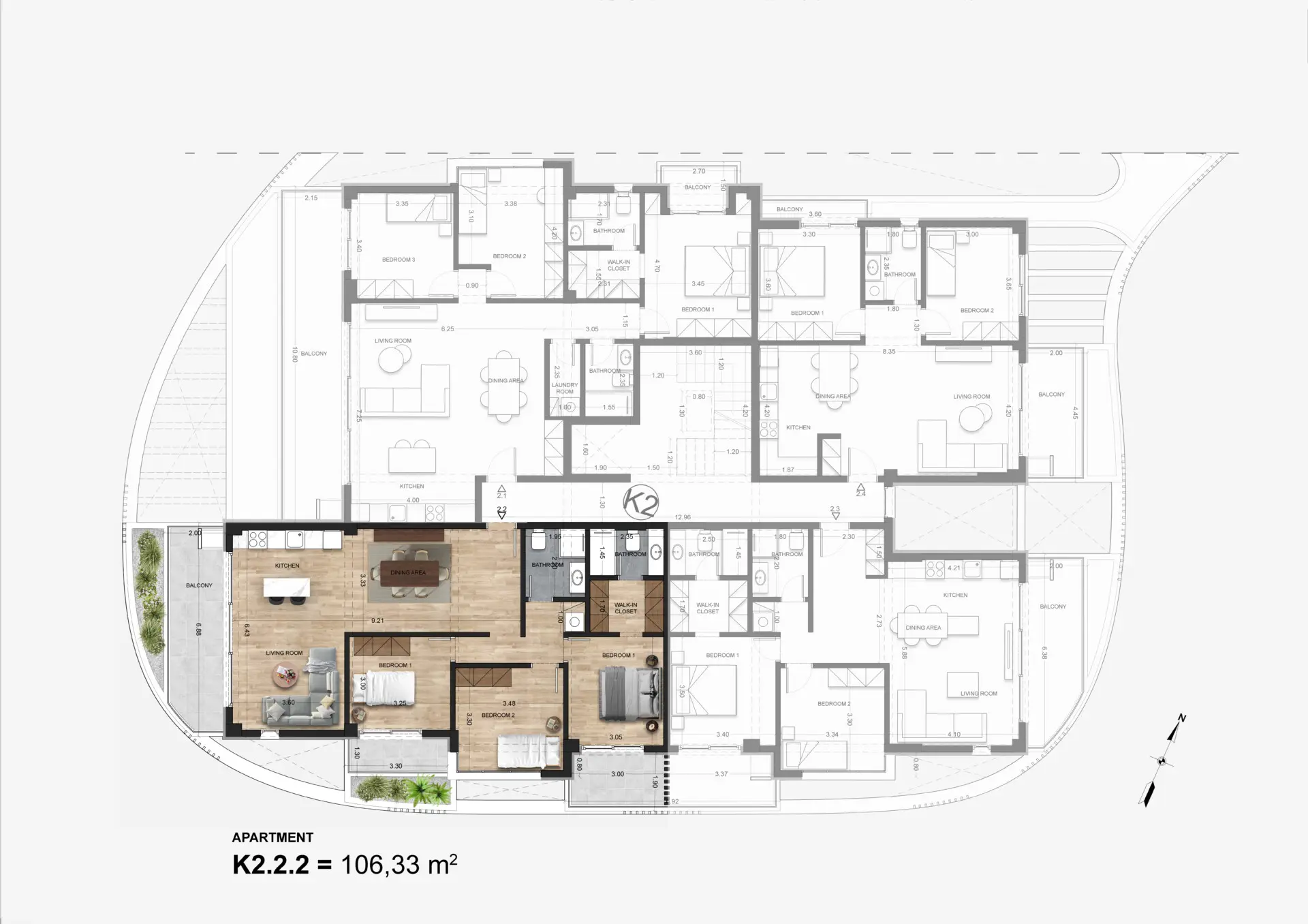 The residential complex consists of two buildings of up to four floors and includes 33 apartments of various types. The project features contemporary architecture with an emphasis on light, space, and privacy. The gated and landscaped grounds include a green inner courtyard with walking paths, relaxation areas, a private park, a children’s playground, and a dedicated outdoor barbecue area for social gatherings. Residents have exclusive access to a fully equipped indoor gym and a recreation area with lounge space and kitchen.