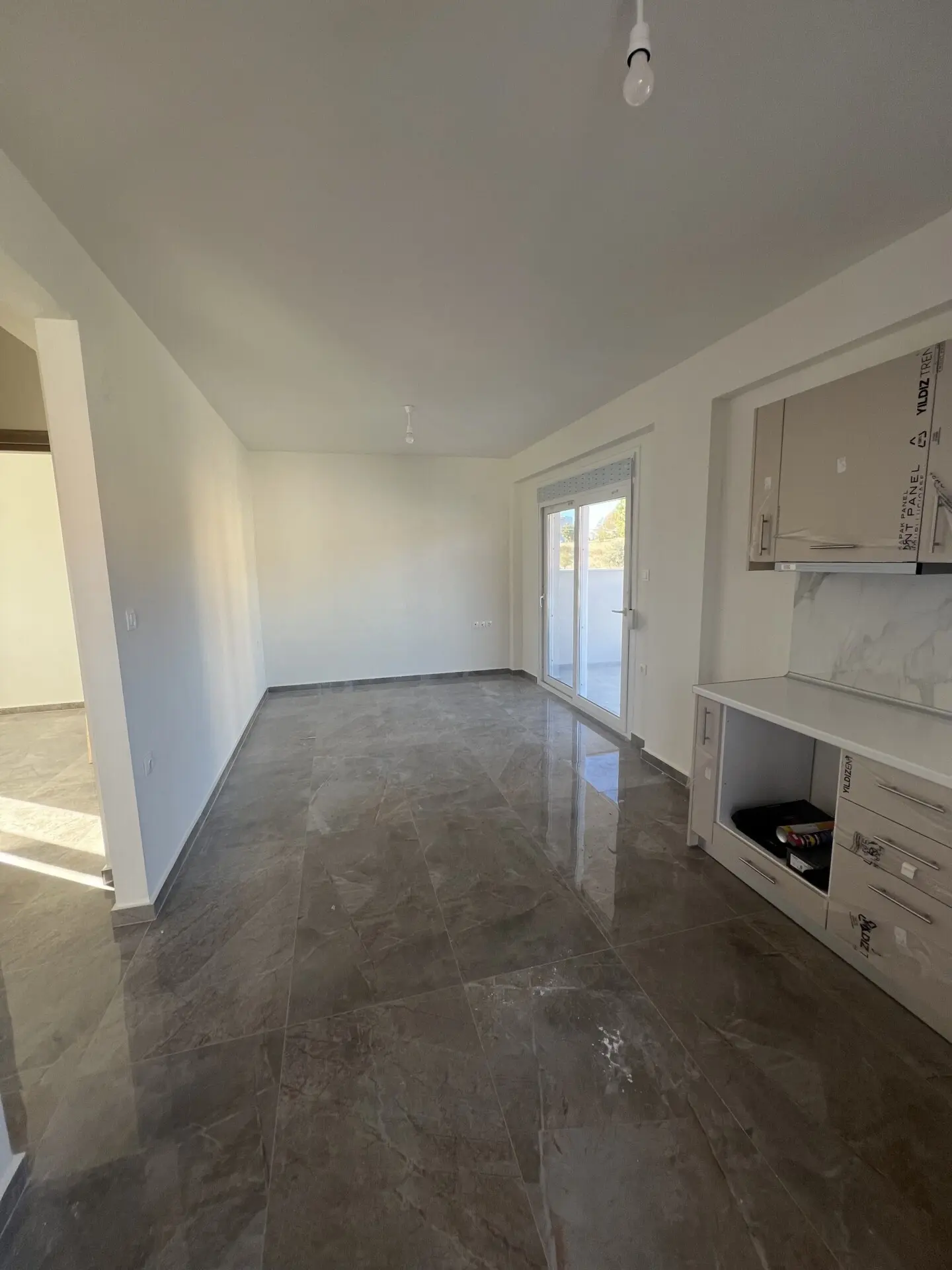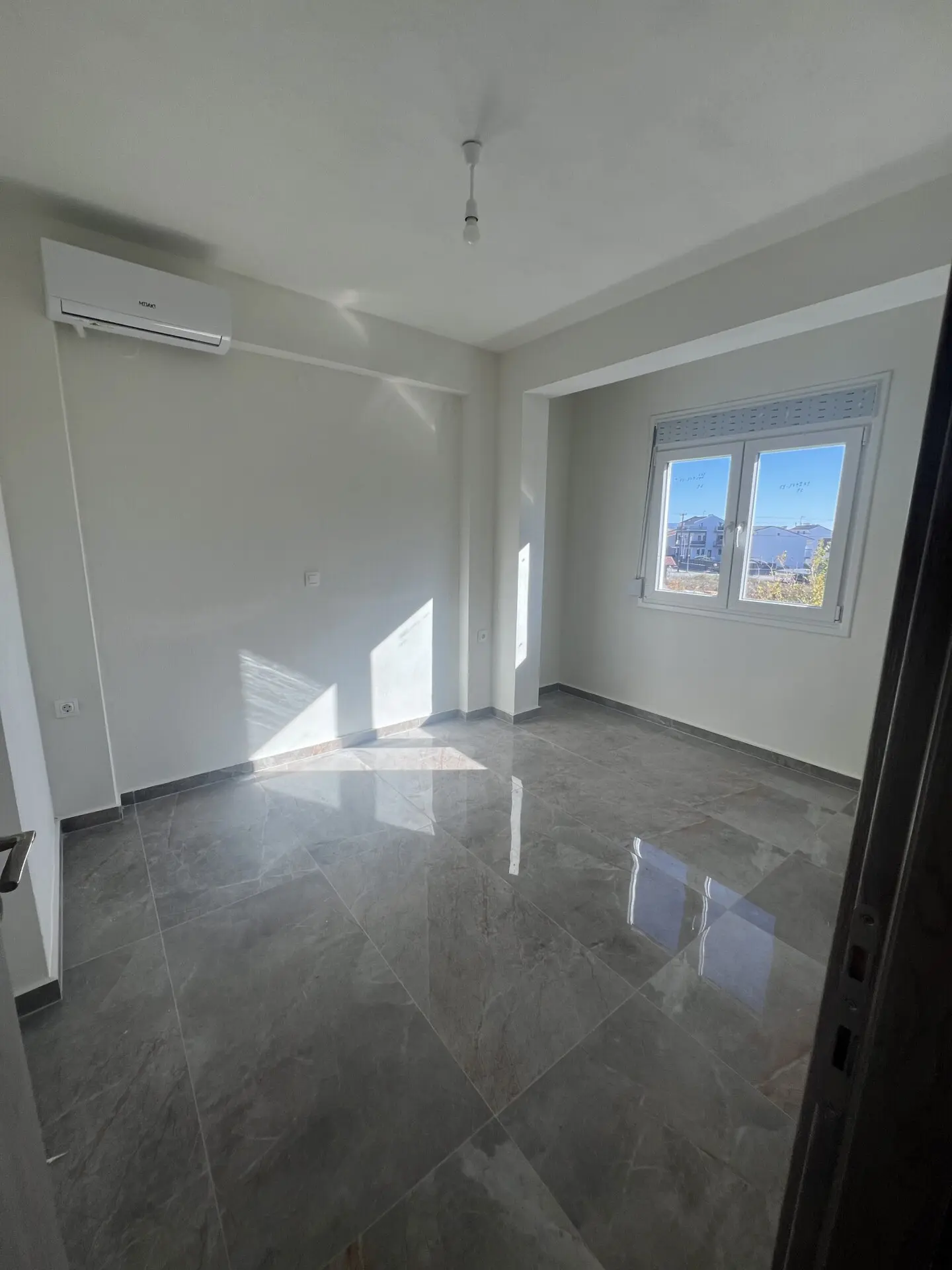 Apartment for sale, 60 sq.m., in Nikiti, Sithonia, located on the ground floor, with a private plot of 100 sq.m. The layout includes a living room combined with a kitchen, two bedrooms, and a bathroom with a shower. The apartment is equipped with air conditioning in all rooms, solar panels for hot water heating, mosquito screens on the windows, and one parking space. The apartment will be completed in April 2027, and the photos shown are indicative. The ground-floor location and private plot make this property an excellent option for permanent residence, holiday use, or rental.