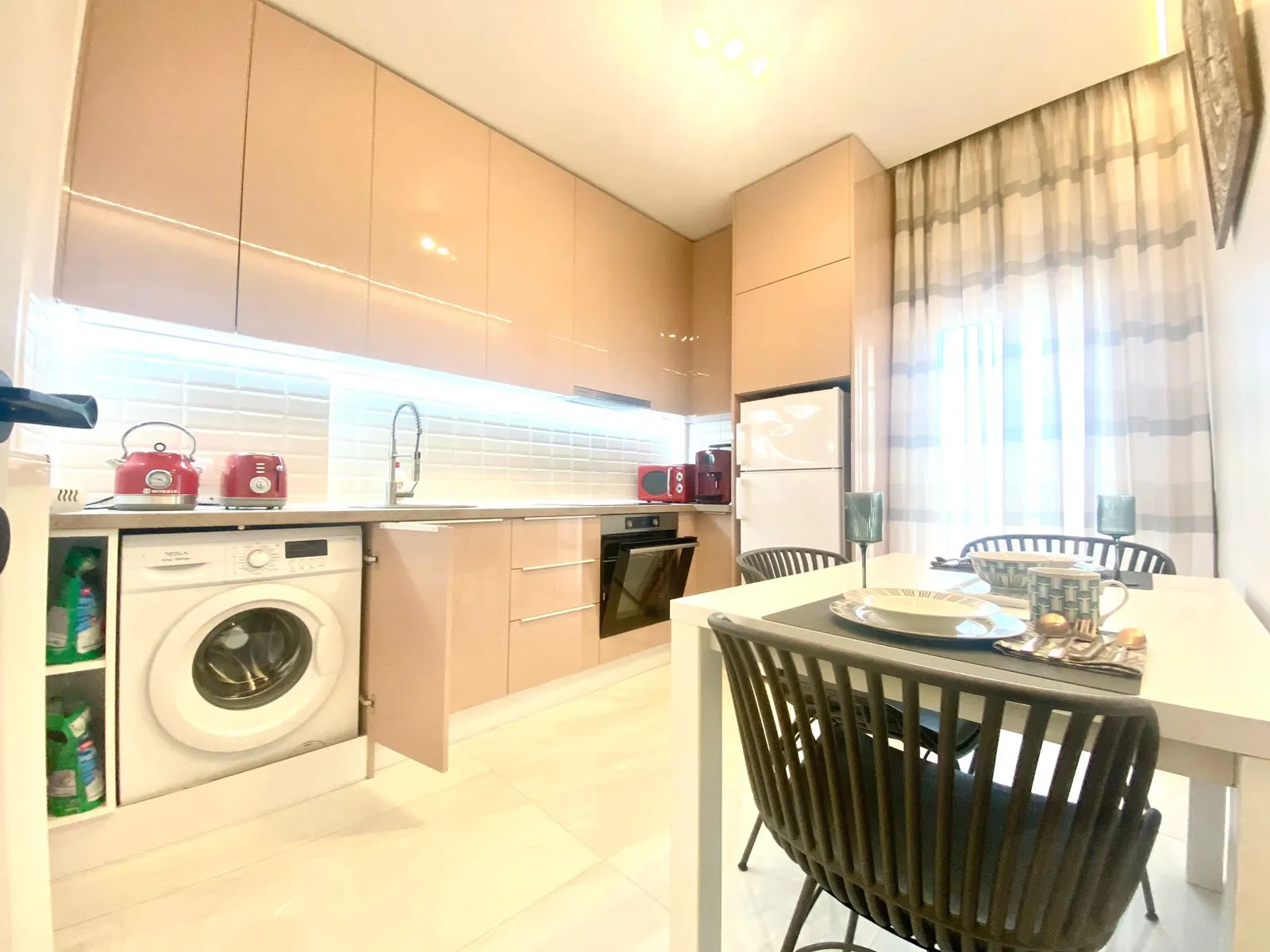 The apartment includes two bedrooms equipped with built-in wardrobes and appealing designs, a luminous living room adorned with contemporary decor and expansive glass surfaces, along with a fully equipped kitchen that boasts built-in appliances and ergonomically designed storage solutions.