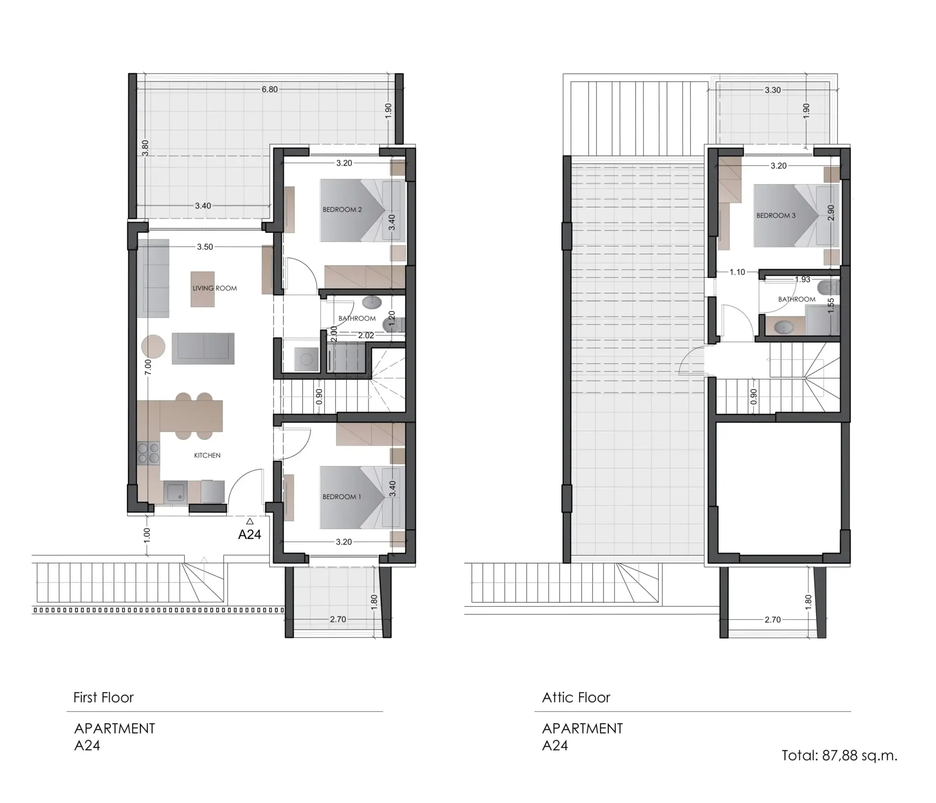 Apartment A24, with a total area of 88 sq.m., is a prime example of contemporary architecture and luxurious living in the beautiful area of Kallithea, Halkidiki. Spread across two levels (first floor and attic), it offers comfort, functionality, and elegance within a carefully designed residential complex featuring modern aesthetics and natural materials. Surrounded by lush greenery and located just moments from the sea, the residence also has direct access to the beautifully landscaped communal garden and the impressive shared pool.