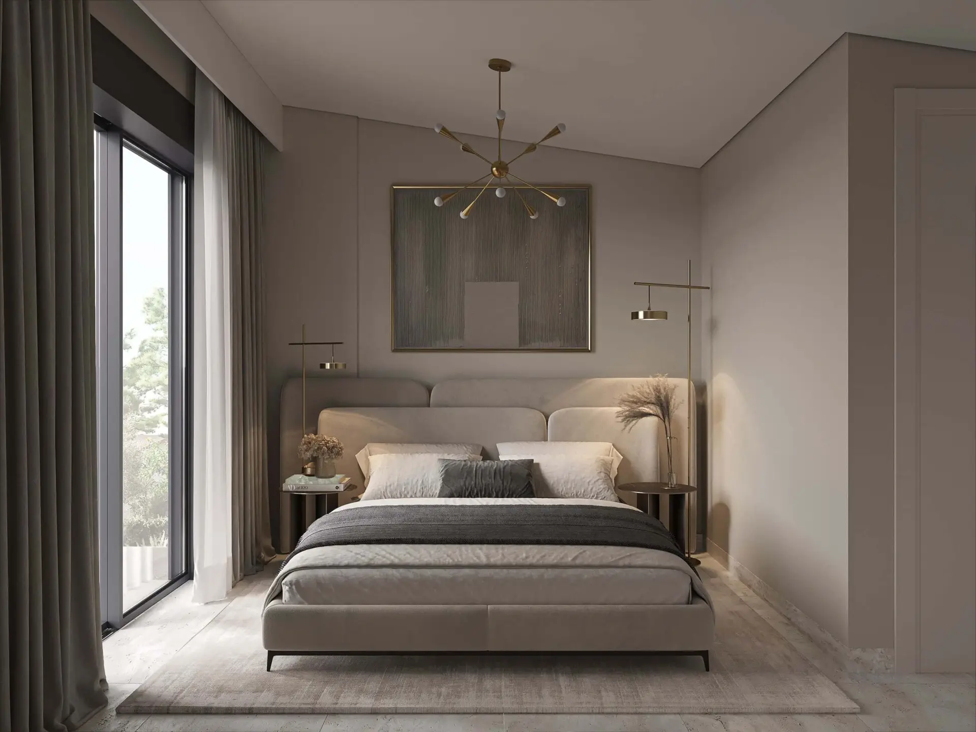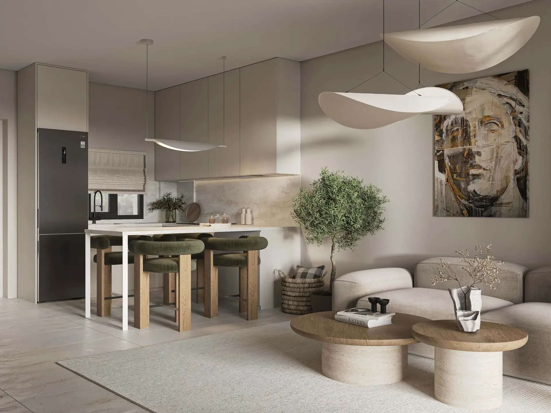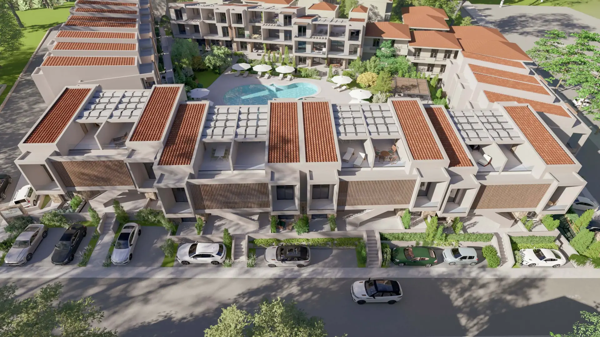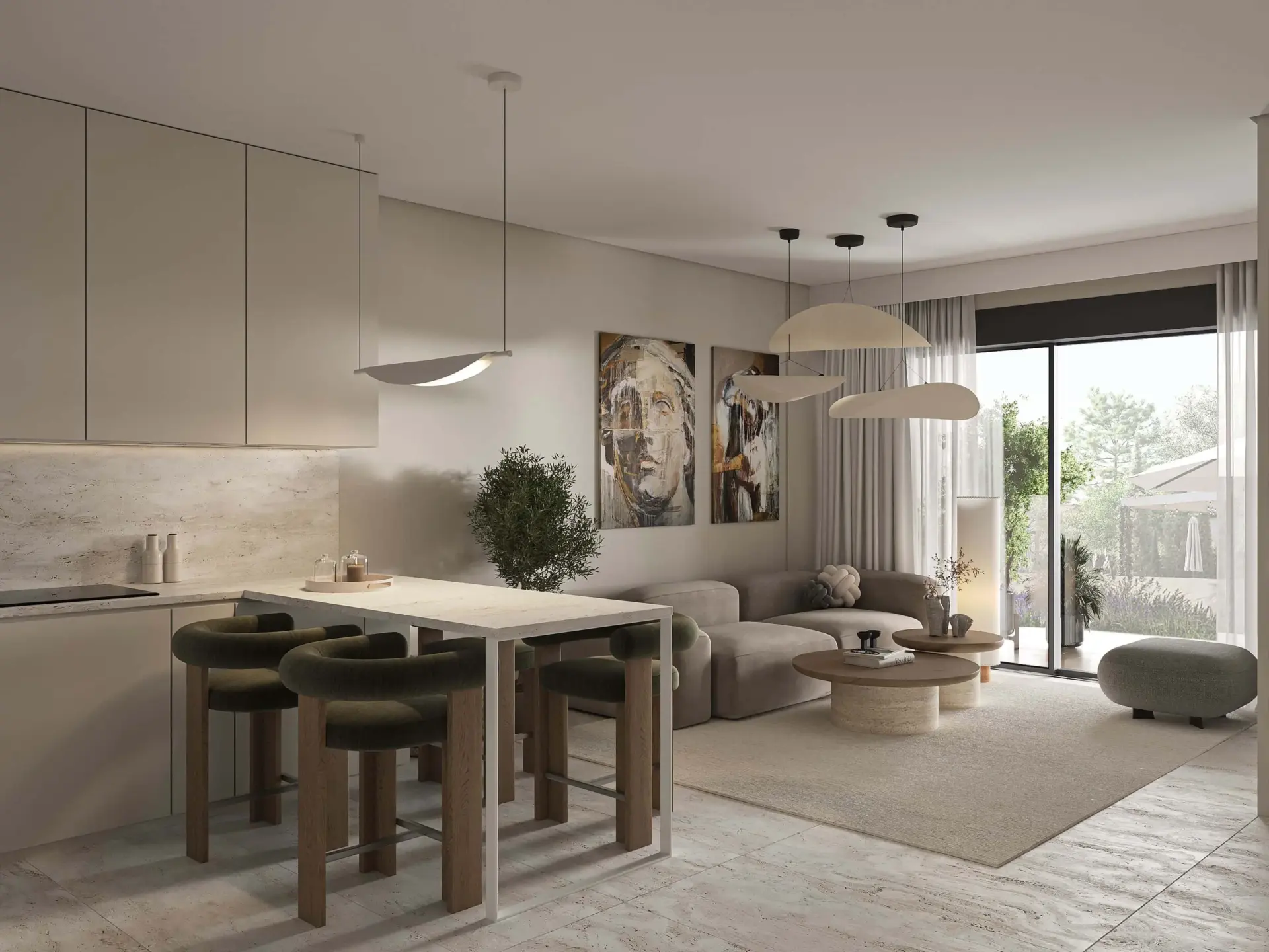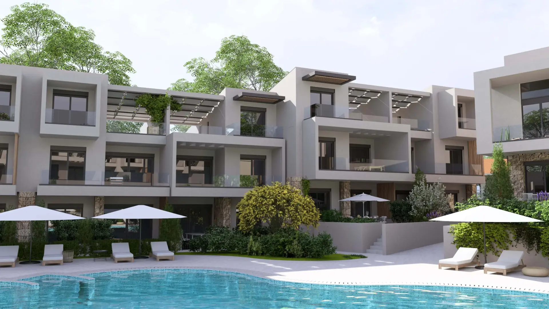 On the first floor, the apartment features two bright bedrooms with large wardrobes, ergonomic furniture, and a refined minimal design, as well as a fully equipped bathroom with a shower, floating vanity, and round mirror. The open-plan kitchen and living area form the heart of the home, beautifully styled in natural and earthy tones, with modern lighting and direct access to the spacious balcony (61 sq.m) — ideal for relaxation and entertaining, overlooking the outdoor area.