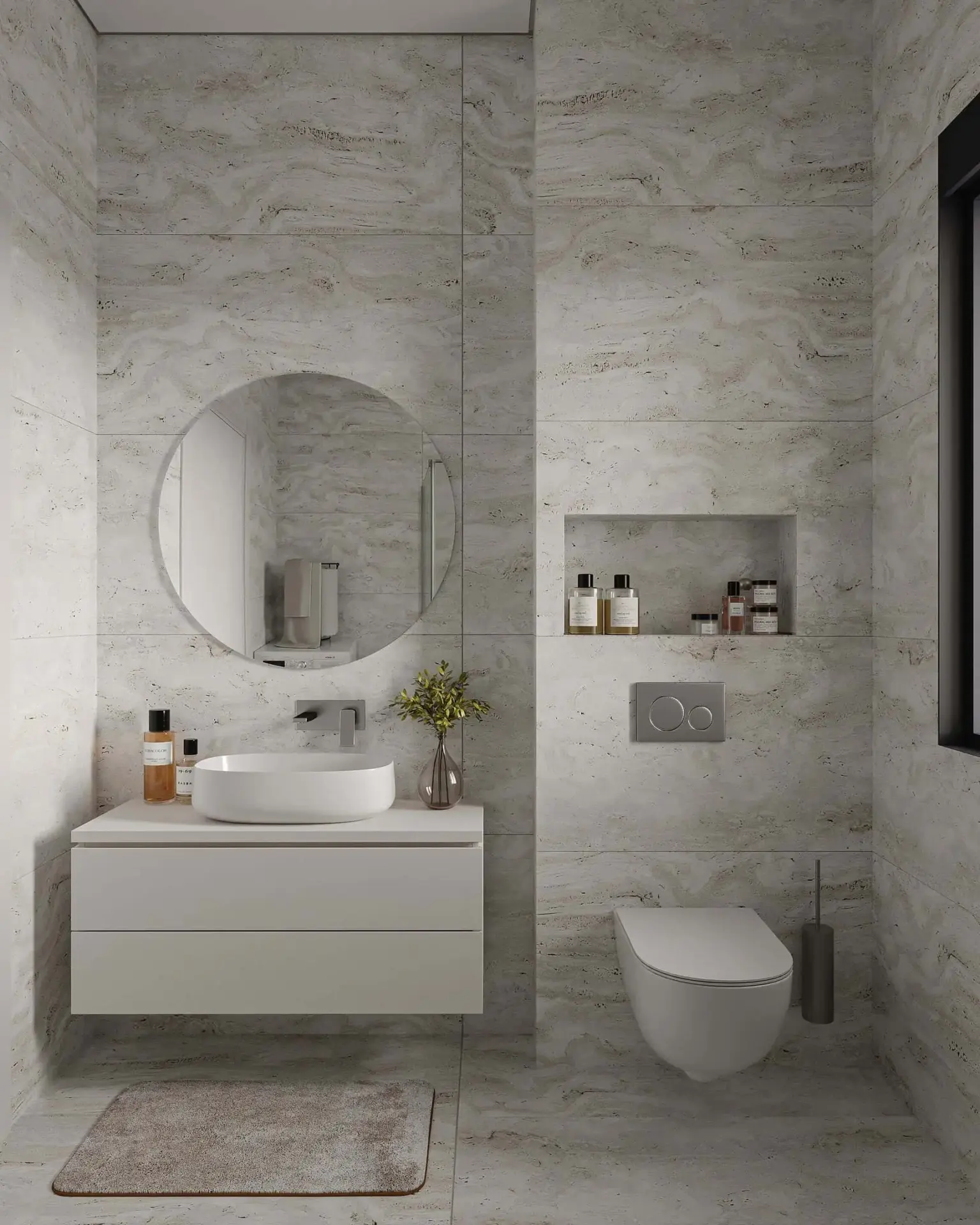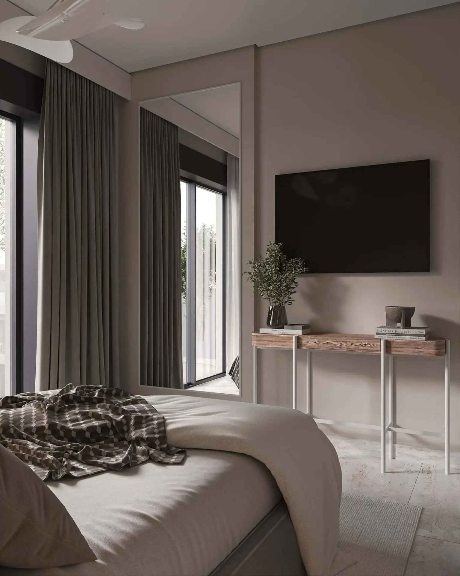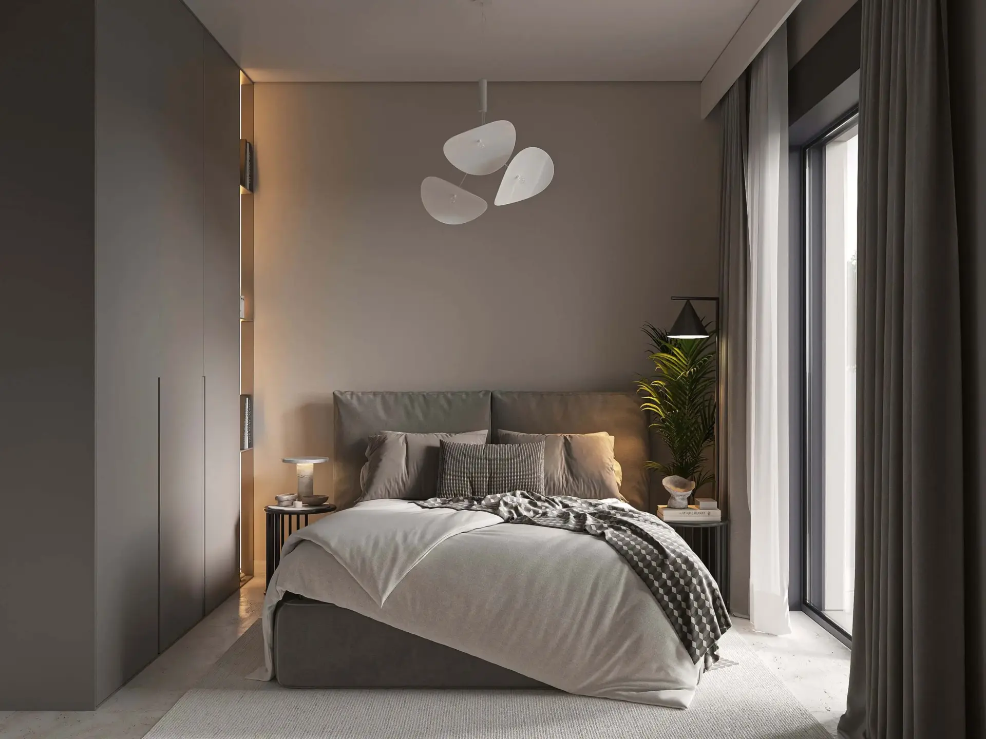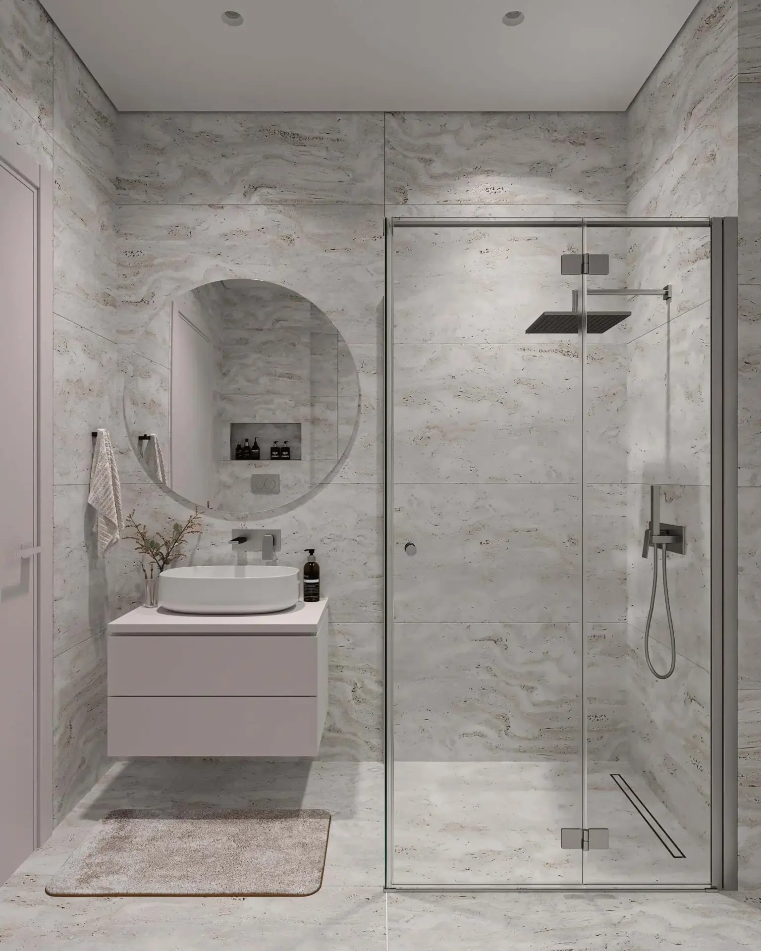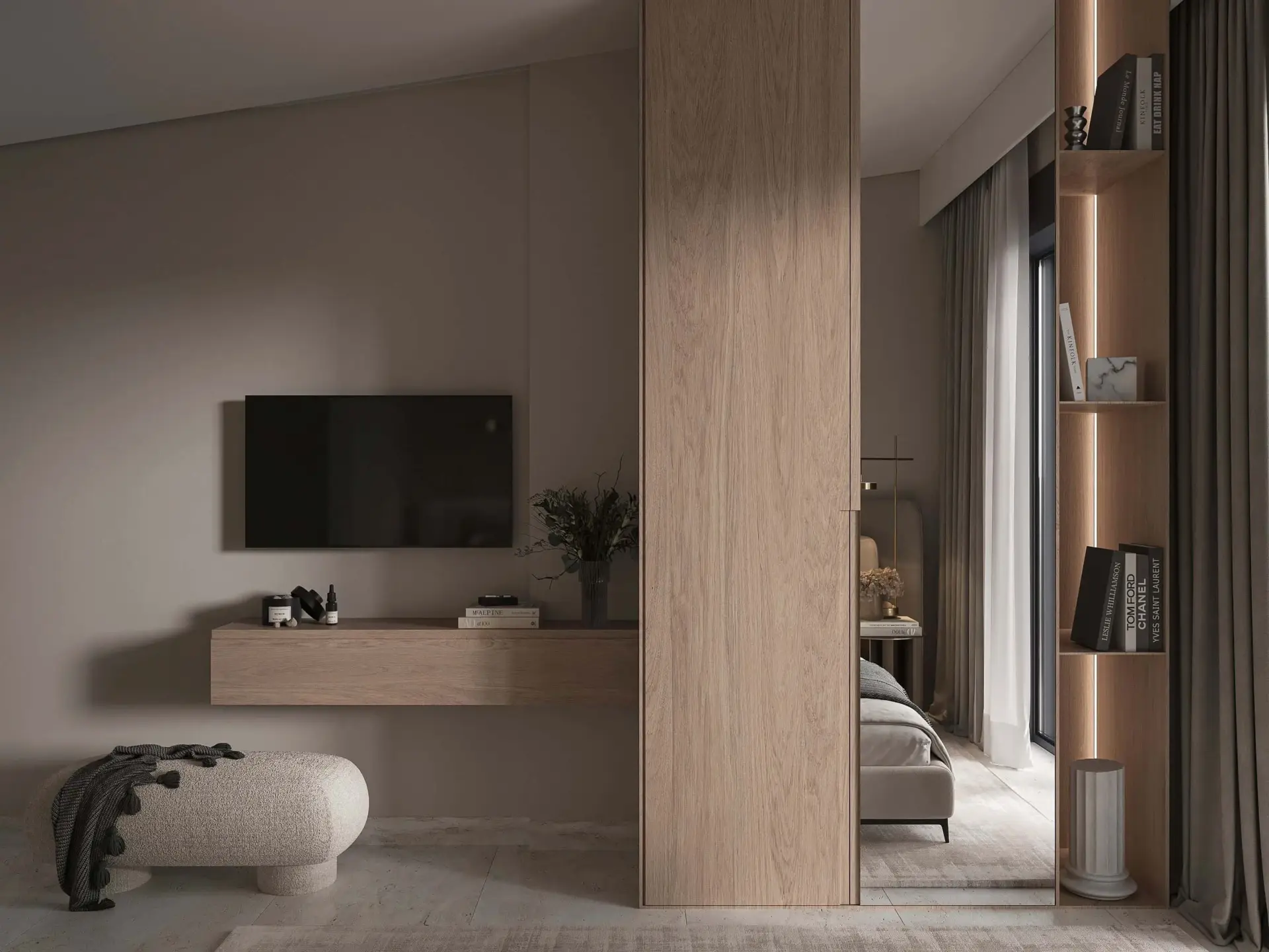 On the first floor, the apartment features two bright bedrooms with large wardrobes, ergonomic furniture, and a refined minimal design, as well as a fully equipped bathroom with a shower, floating vanity, and round mirror. The open-plan kitchen and living area form the heart of the home, beautifully styled in natural and earthy tones, with modern lighting and direct access to the spacious balcony (61 sq.m) — ideal for relaxation and entertaining, overlooking the outdoor area.