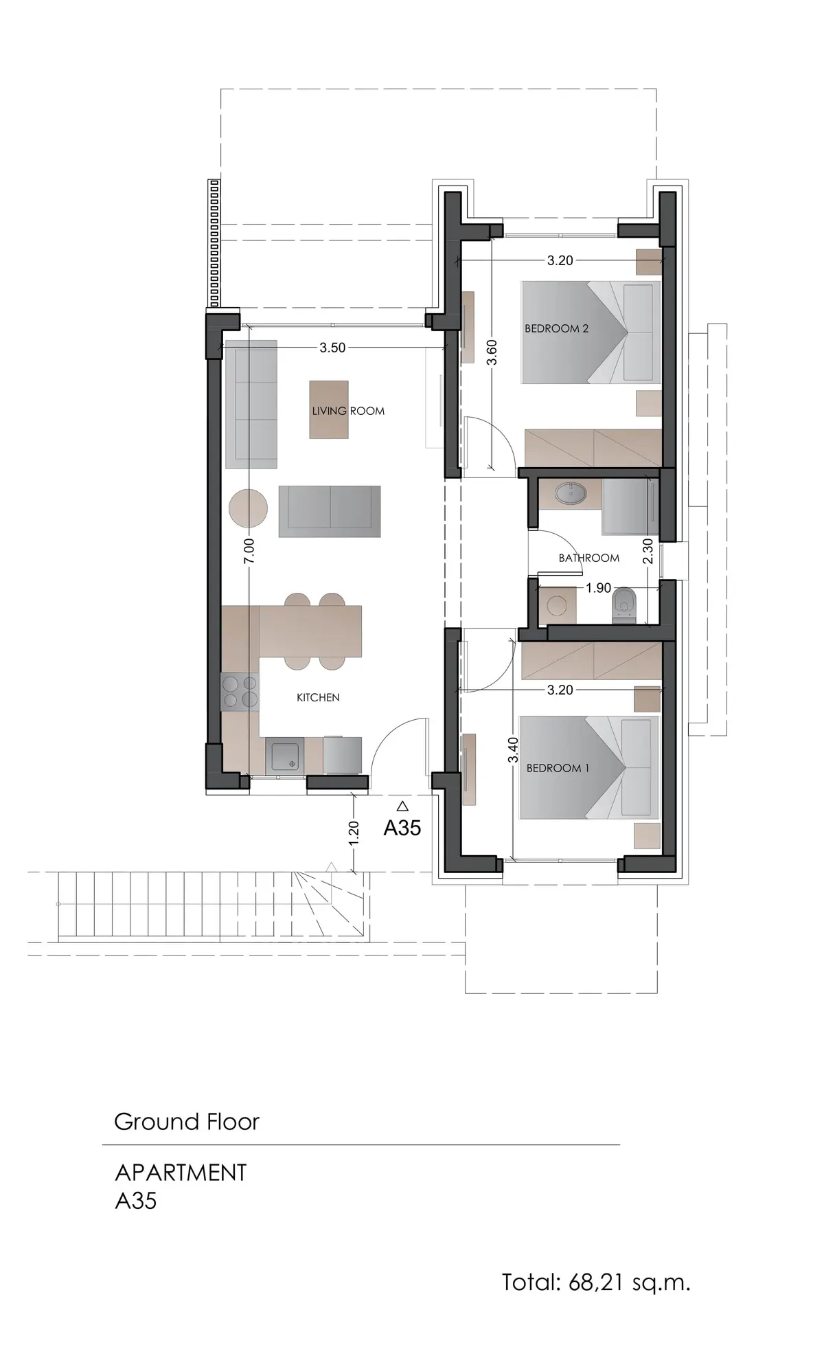 Apartment A35, with a total area of 68 sq.m., is located in the heart of Kallithea, Halkidiki, and is an ideal choice both for private residence and investment. It is situated on the ground floor and harmoniously blends into a contemporary, elegant residential complex with modern architectural aesthetics, clean lines, and natural materials, surrounded by lush greenery and an impressive pool area.