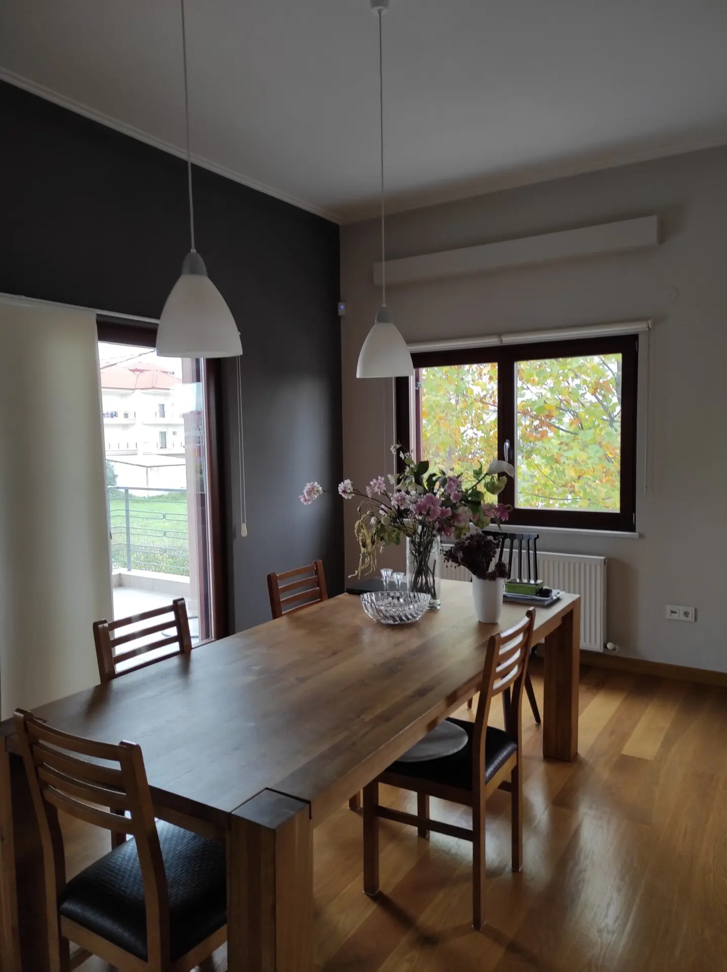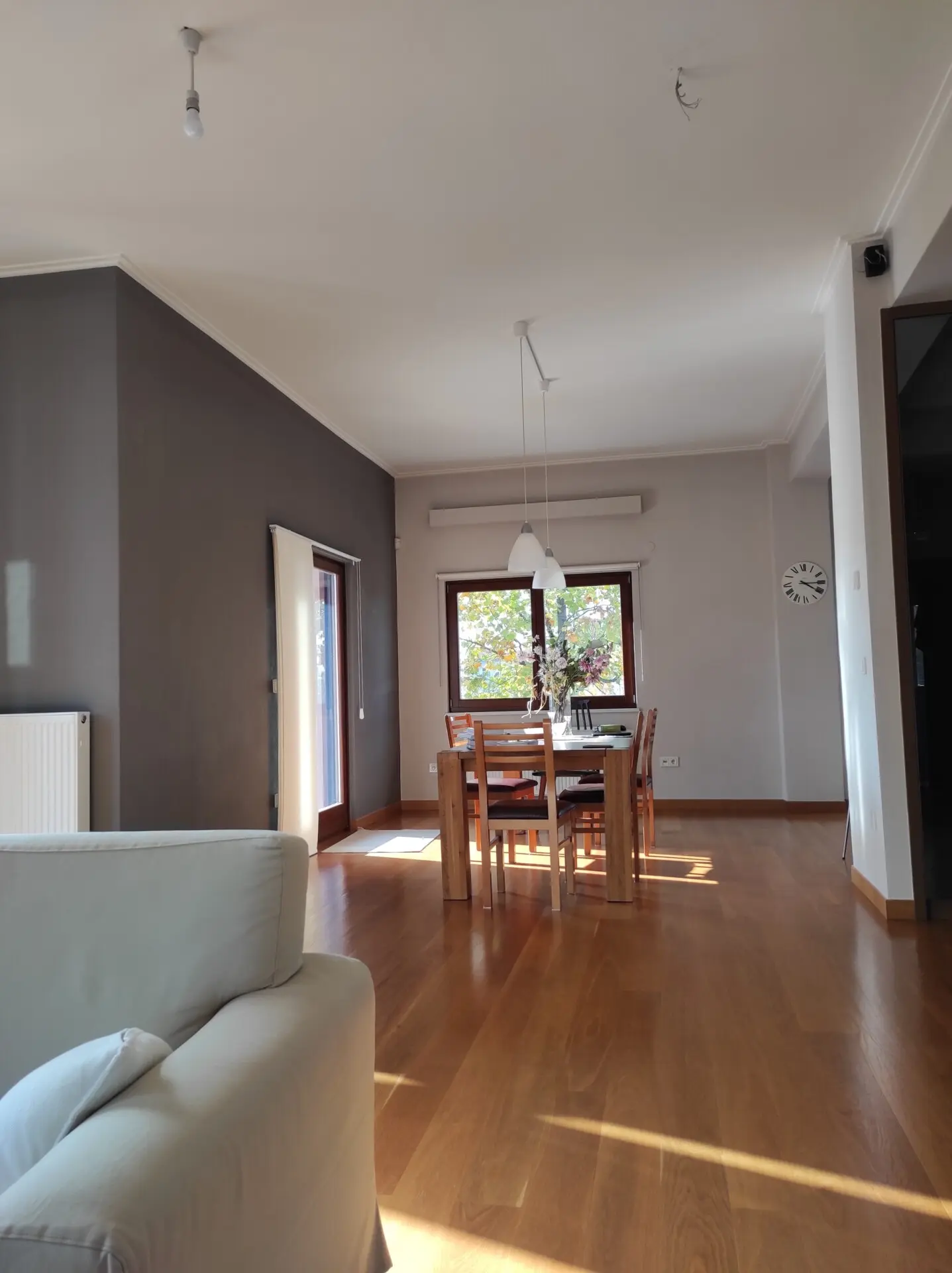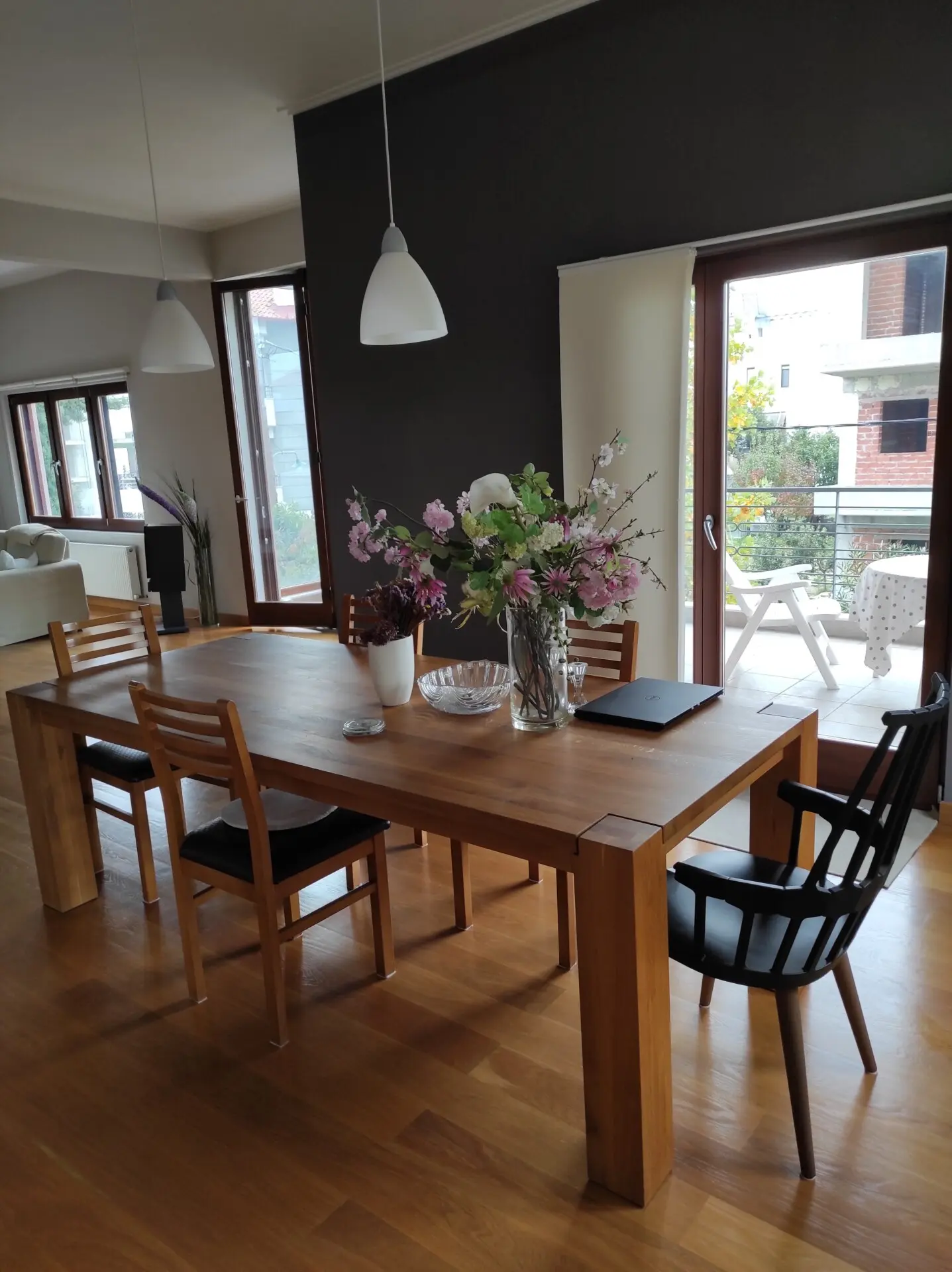 The maisonette of the first and second floors, with a total area of 230 sq.m., is connected by an internal wooden staircase made of solid oak. The first floor includes a spacious kitchen, living-dining area, bathroom, and office, while the second floor has four comfortable bedrooms, a dressing room, and a bathroom.