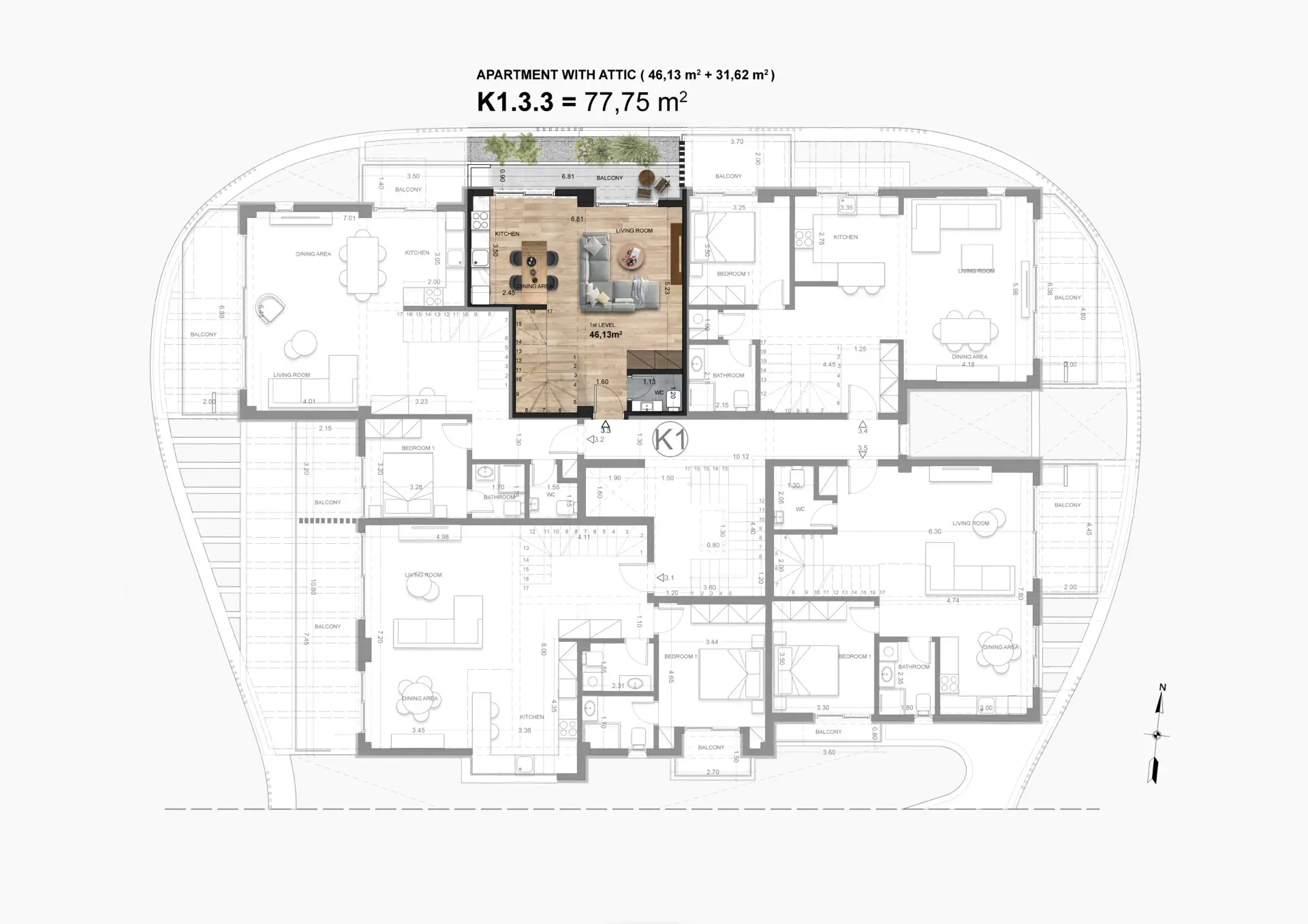 For sale is a modern apartment in a newly built premium residential complex located in one of the most prestigious seaside areas of Thessaloniki, Kalamaria. The property is situated in a quiet and fully developed residential area just a few minutes from the sea, with easy access to the city center and a metro station only 250 m away, as well as all essential infrastructure, making it ideal for both comfortable living and investment. The complex consists of two buildings of up to four floors and a total of 33 apartments, featuring contemporary architecture focused on light, space, and privacy, while the gated and landscaped grounds include a green inner courtyard, walking paths, relaxation areas, a private park, a children’s playground, and an outdoor barbecue area. Residents enjoy exclusive access to a fully equipped indoor gym and a recreation area with lounge space and kitchen. The apartment offers a functional layout with a spacious living room and open-plan kitchen, bathroom, WC with shower, a separate laundry room, and a comfortable balcony, with large windows providing abundant natural light. High-quality modern materials, a smart home system, and gas underfloor heating are included, with A+ energy efficiency standards. All apartments include a private storage room, while apartments with two bedrooms or more also include a private parking space, with both underground and above-ground parking available. Kalamaria is one of the most sought-after areas of Thessaloniki, offering proximity to the sea, marinas, parks, cafés, and restaurants, along with fast access to the city center via the metro, and project completion is scheduled for the first half of 2028, making this property an excellent choice for seaside living or a secure real estate investment.