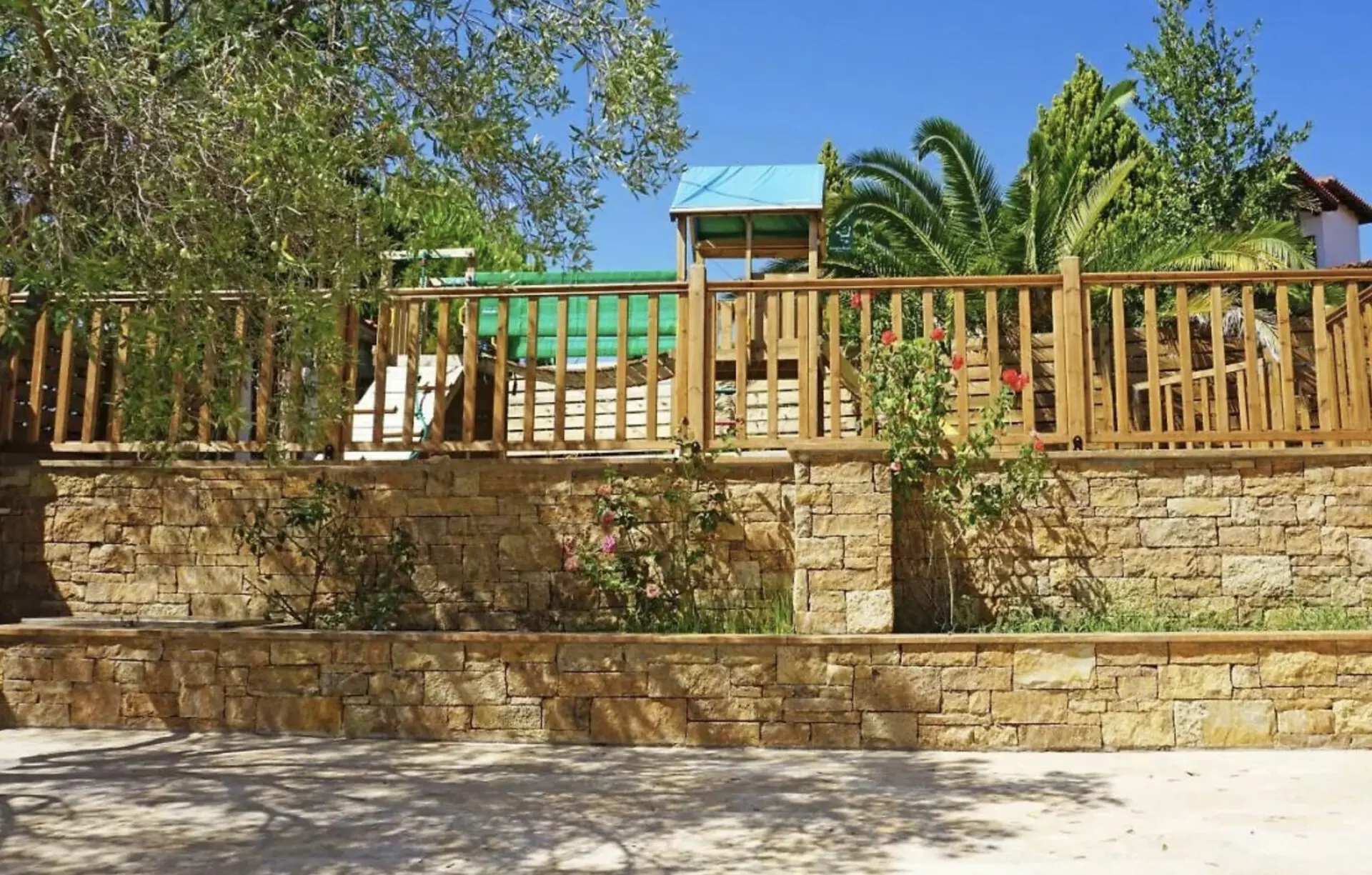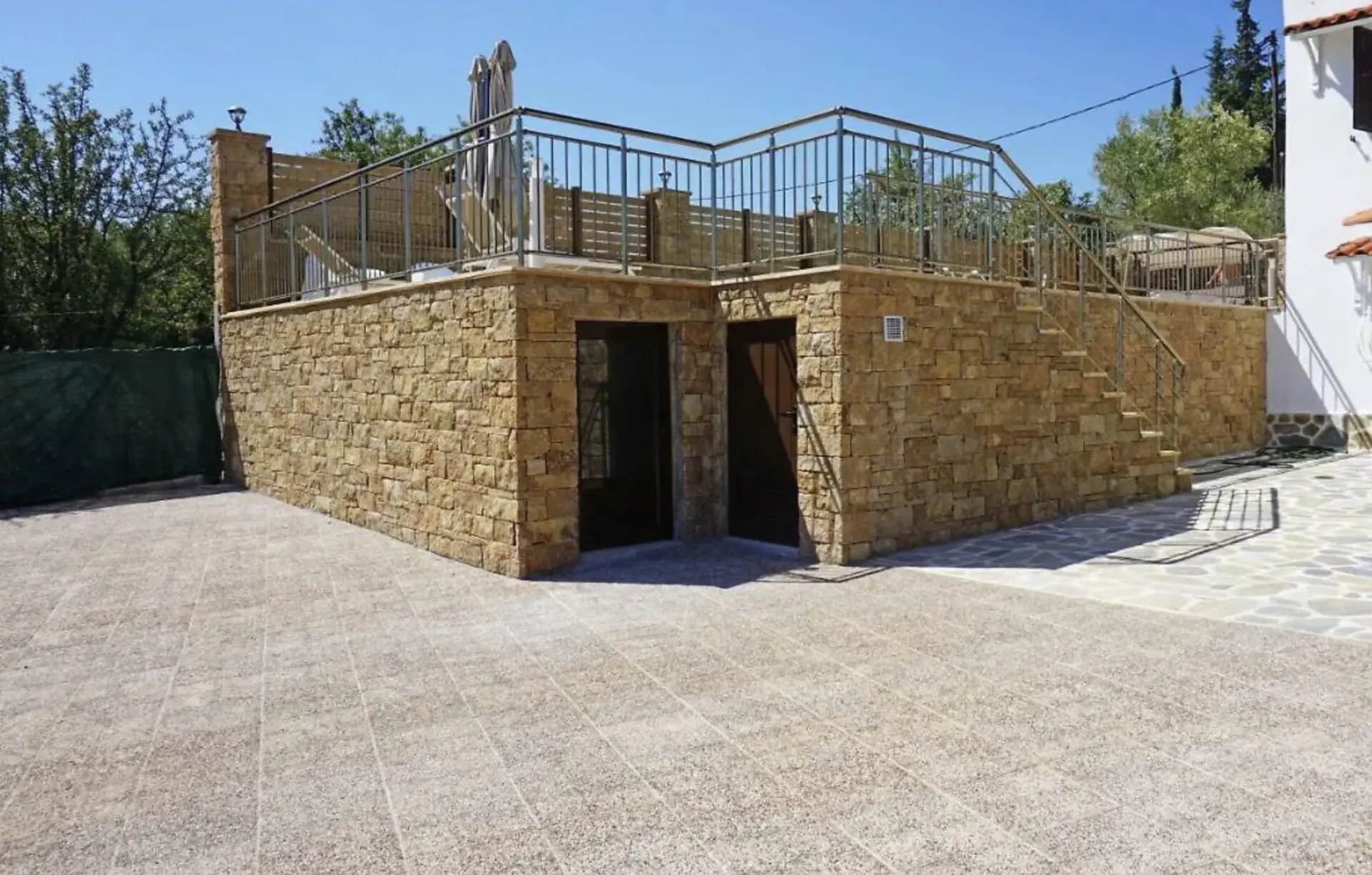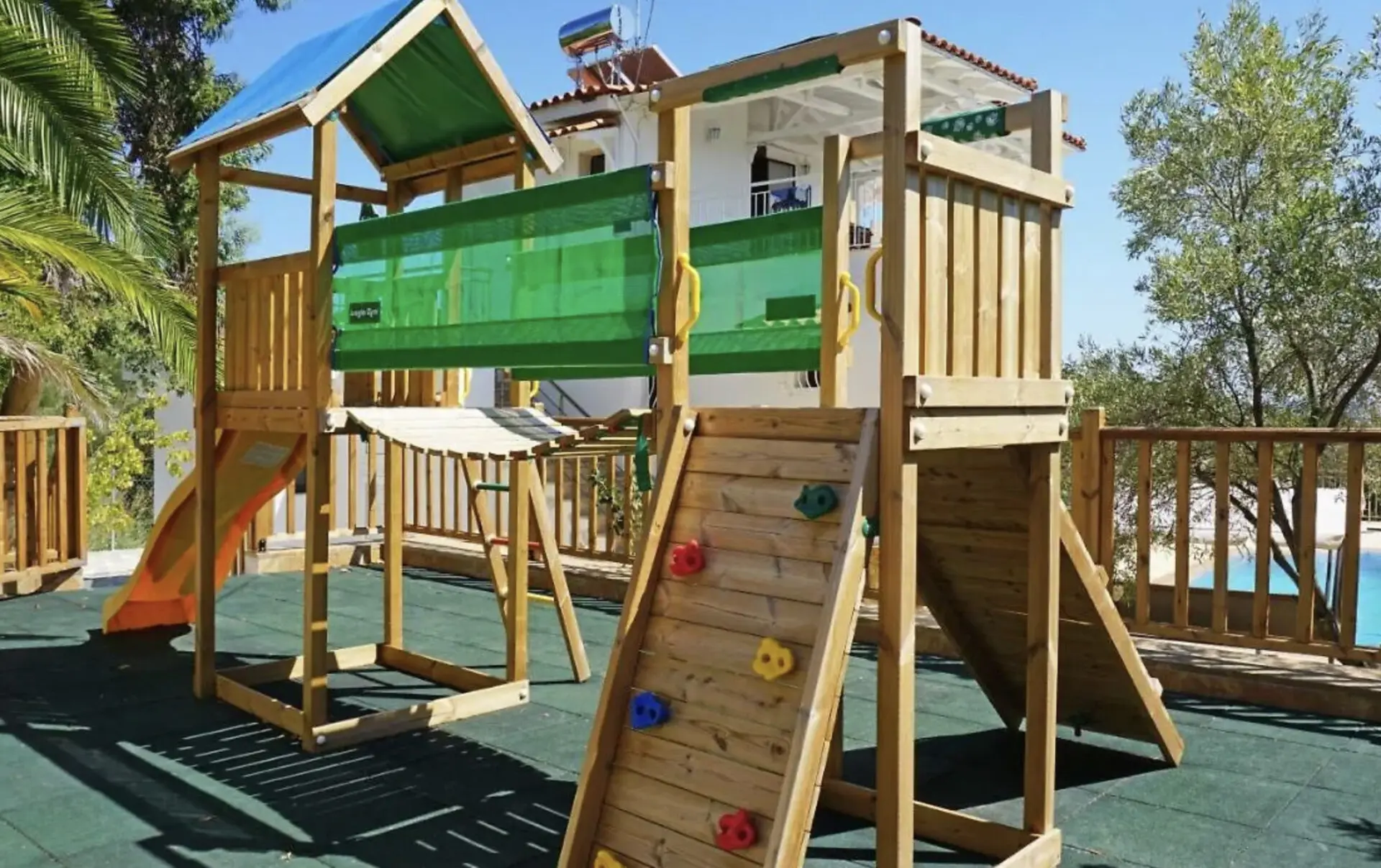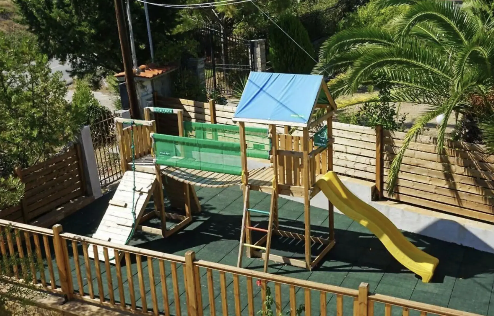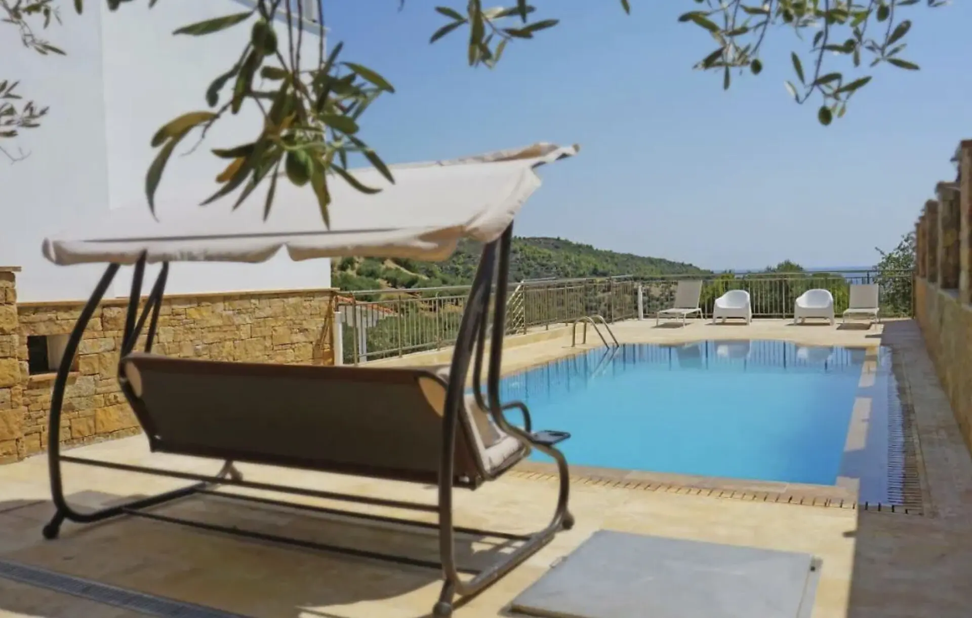 For sale in Nikiti, Sithonia, a villa with a total area of 180 sq.m., developed on three levels connected by an internal staircase. The first level includes a living room with kitchen, bedroom, and bathroom. The second level features a spacious living room with fireplace, bedroom, and bathroom, while the third level consists of a bedroom with its own bathroom and a large veranda with panoramic sea view. On the side of the house, there is an independent studio with a separate entrance. The property is built on a plot of 1,250 sq.m. with a unique sea view. The outdoor area includes a large swimming pool, jacuzzi and sauna, children’s playground, BBQ area, and a lush garden with olive trees.