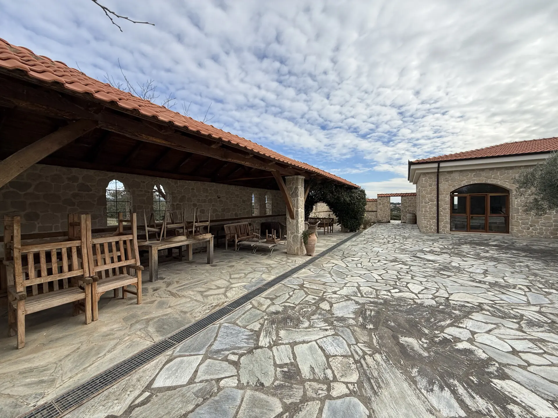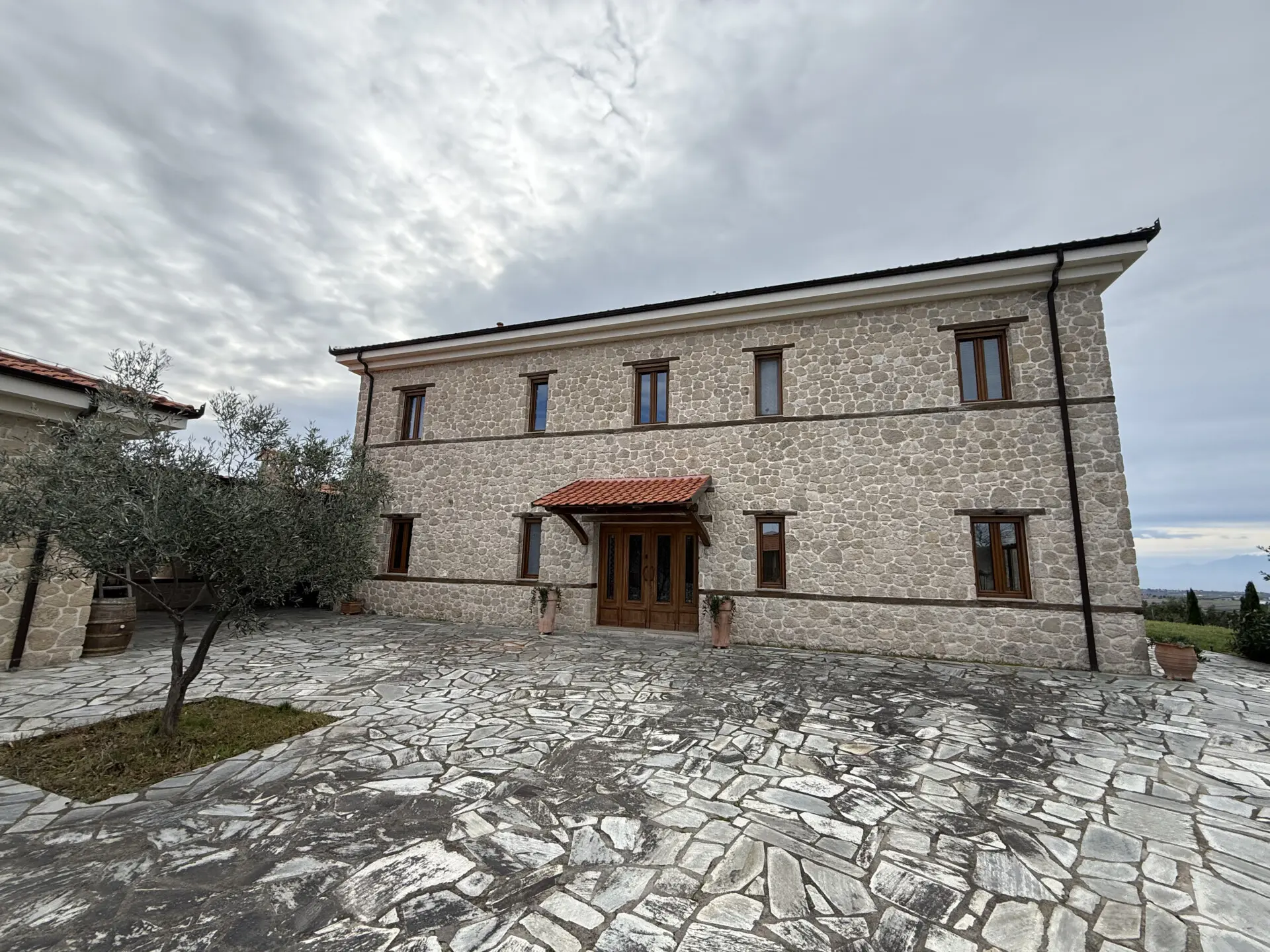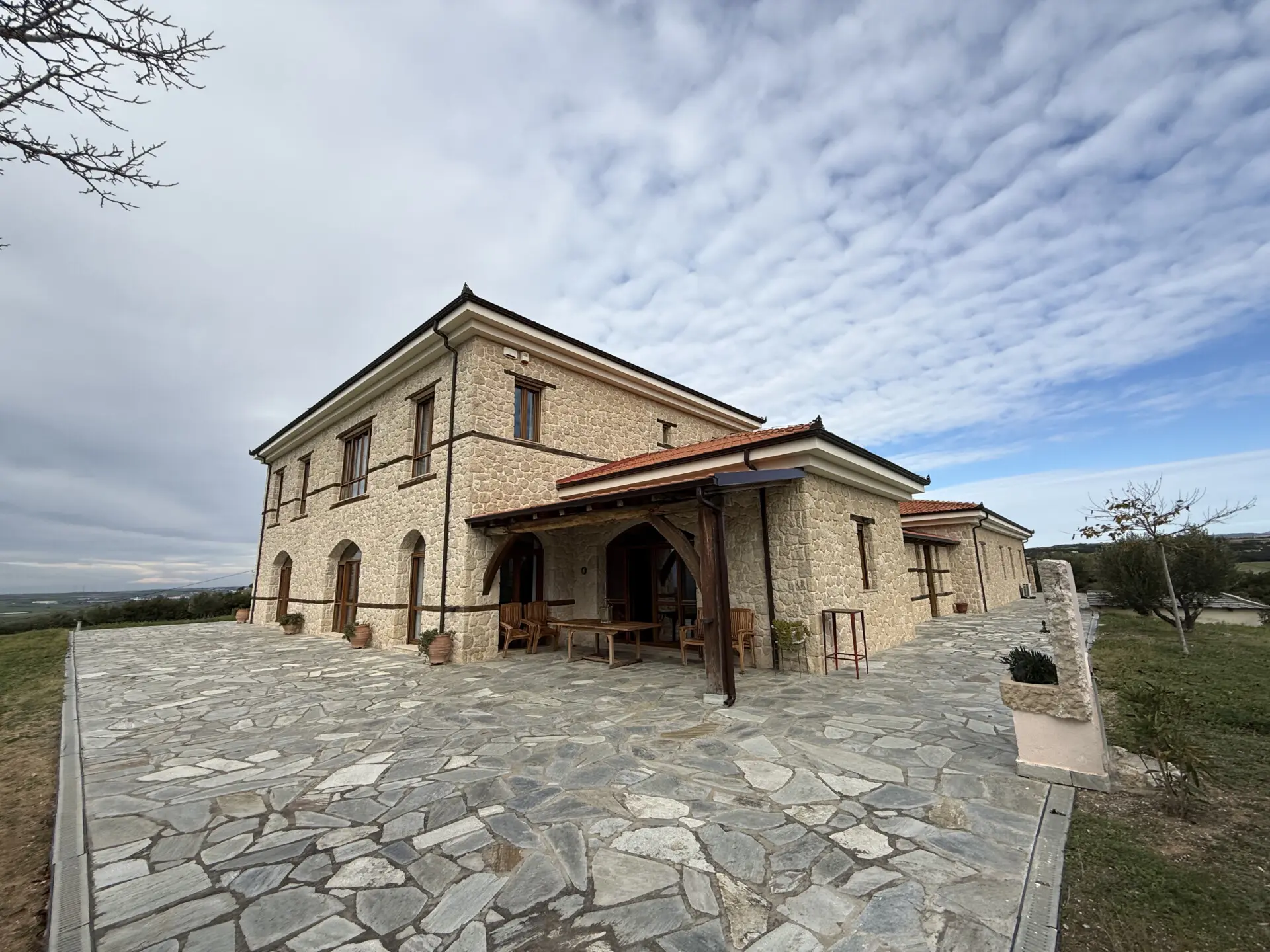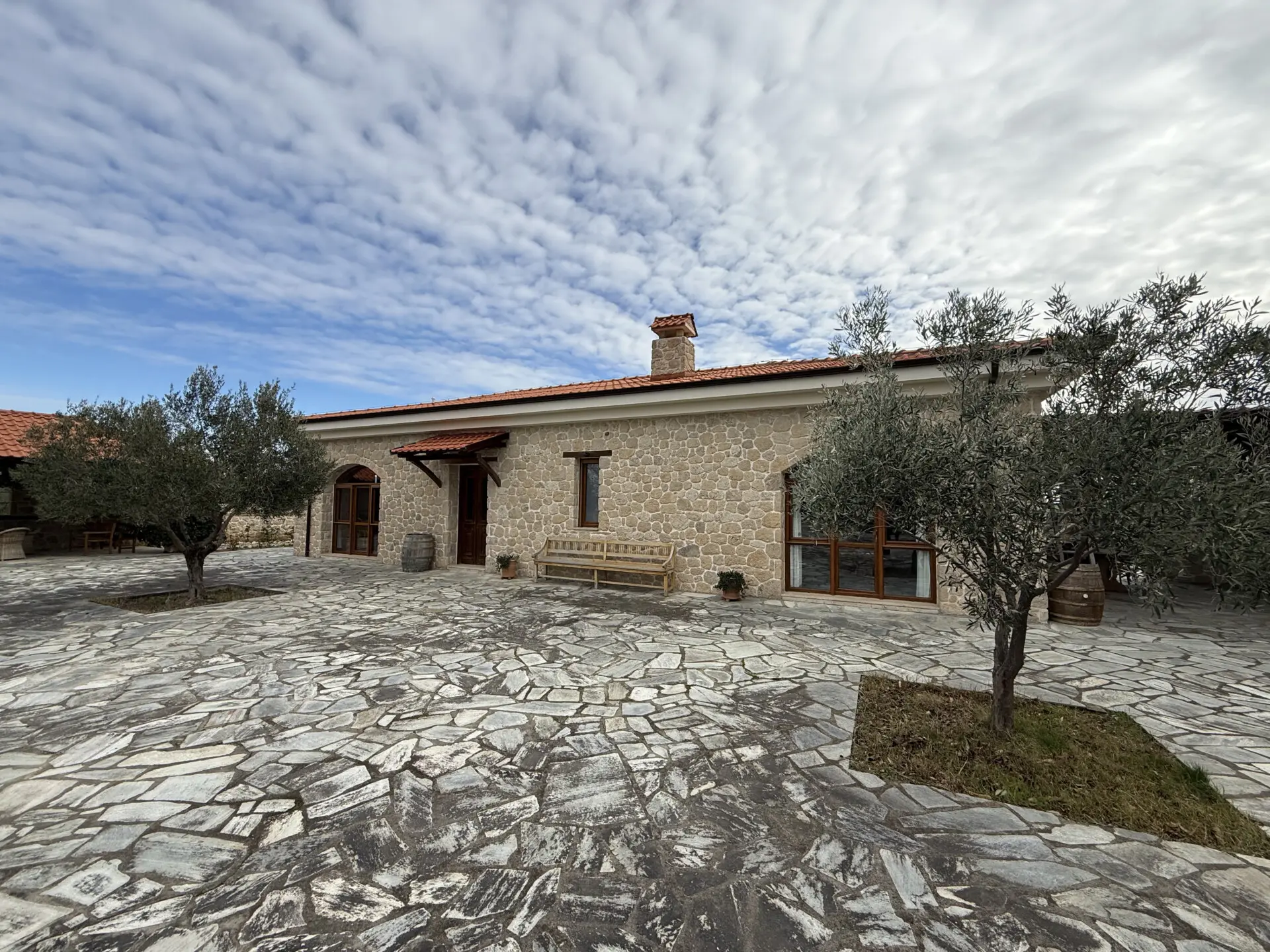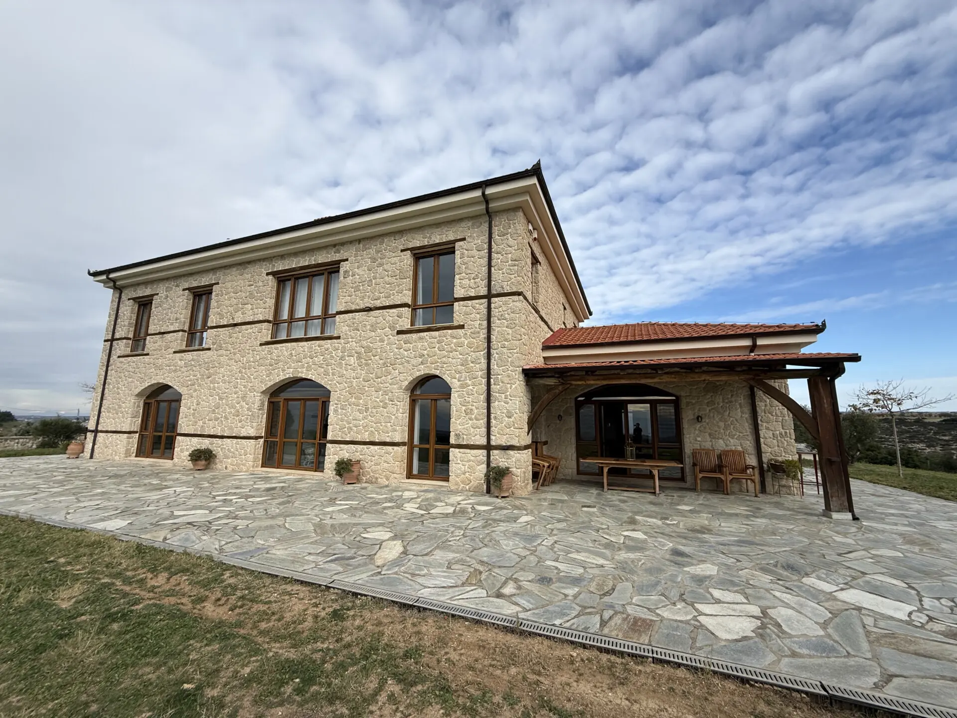 The estate occupies a 30,000 sq.m. plot and is seamlessly integrated into the natural landscape. The architecture follows a traditional Macedonian–Mediterranean style, featuring natural stone, arched details, tiled roofs and solid wooden beams, creating the image of a timeless aristocratic residence.