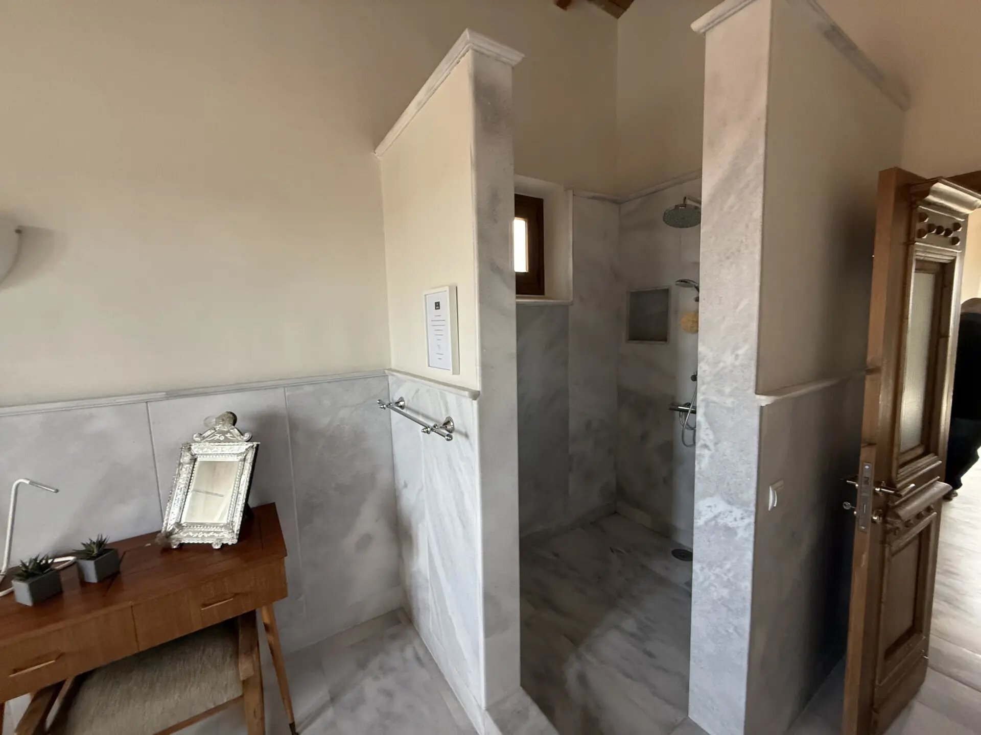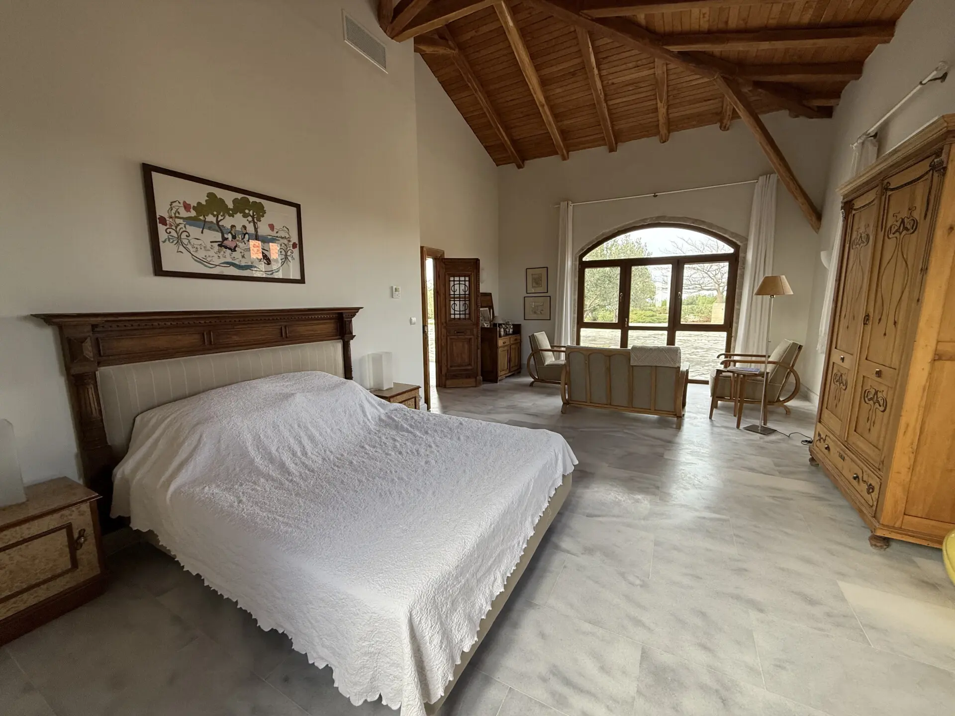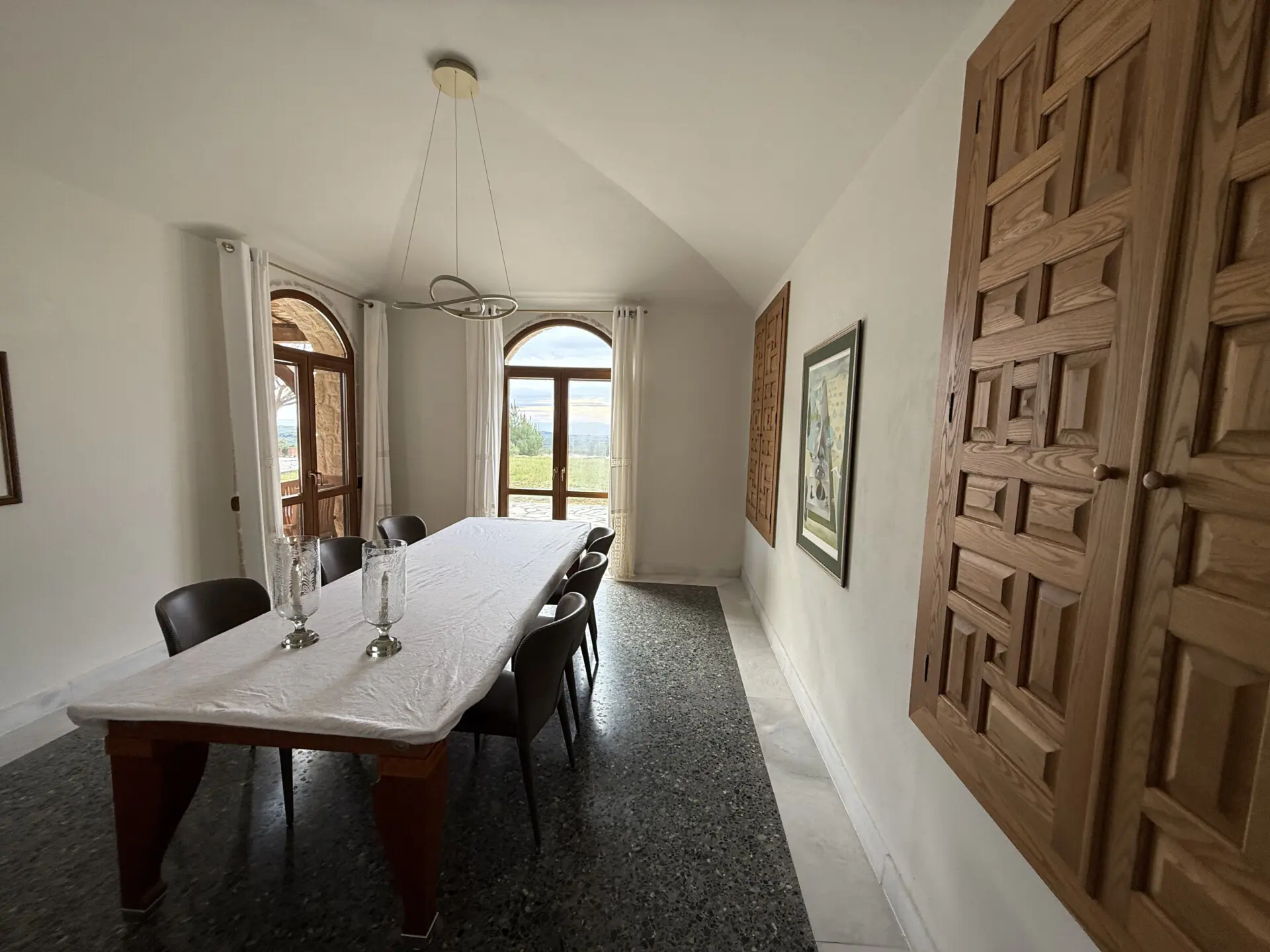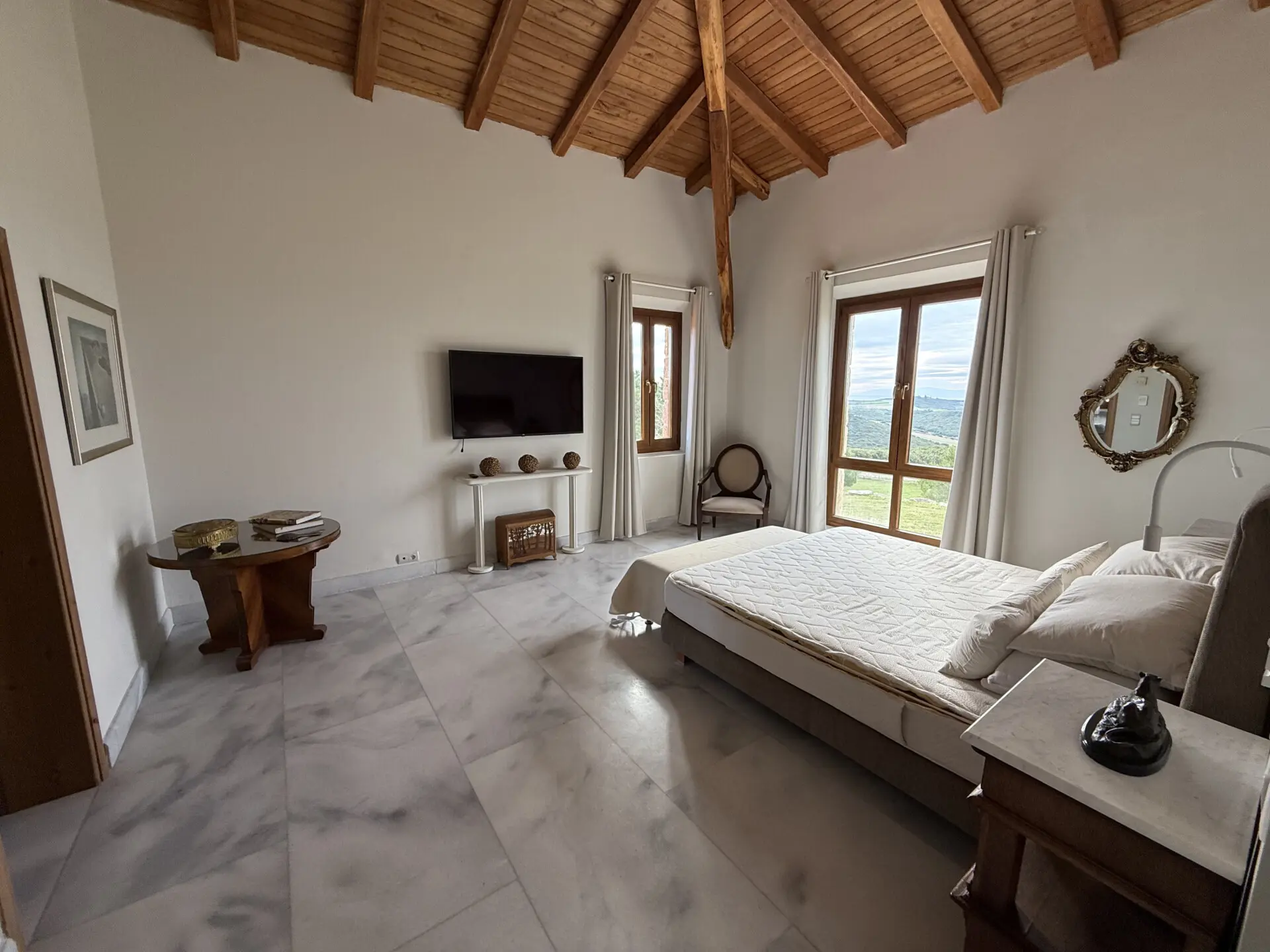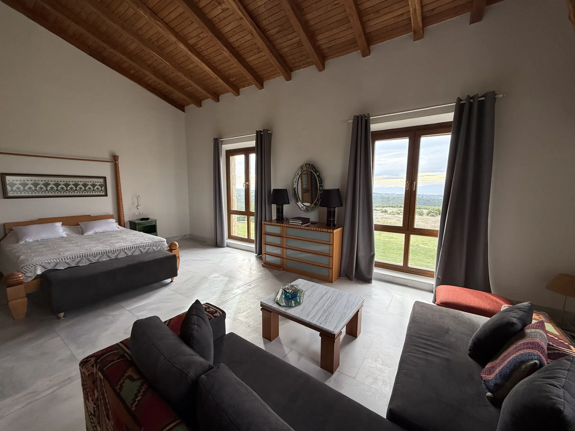 The estate occupies a 30,000 sq.m. plot and is seamlessly integrated into the natural landscape. The architecture follows a traditional Macedonian–Mediterranean style, featuring natural stone, arched details, tiled roofs and solid wooden beams, creating the image of a timeless aristocratic residence.