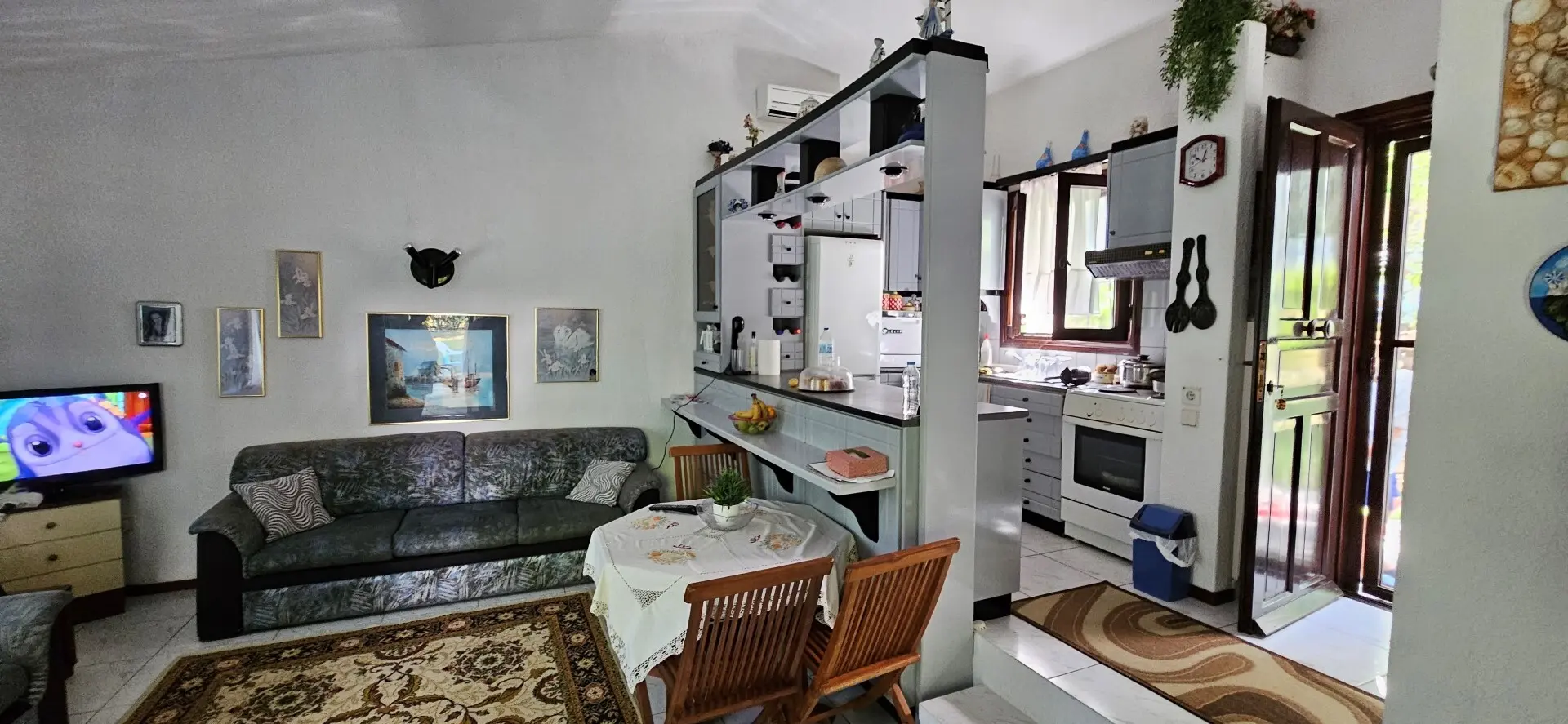 A 78 sq.m. villa is for sale in Sani, Halkidiki. The property is developed on two levels, with the ground floor featuring an open-plan living room with kitchen, one bedroom, and a WC with shower, while the second floor consists of one bedroom. The villa has a fireplace and is sold furnished, making it an ideal choice for a holiday home or investment use.