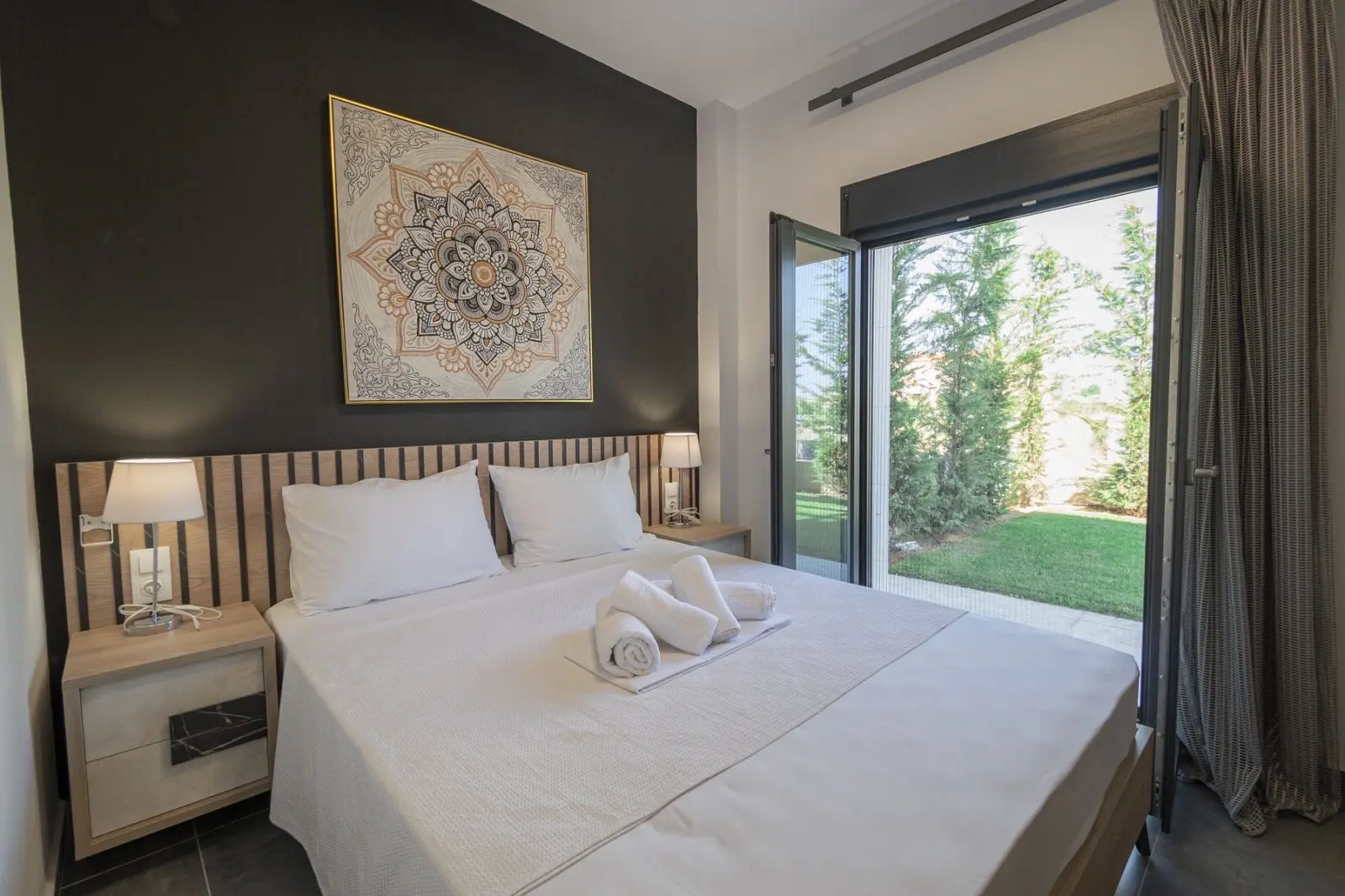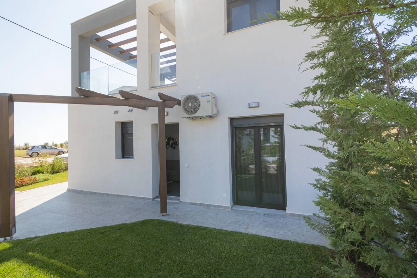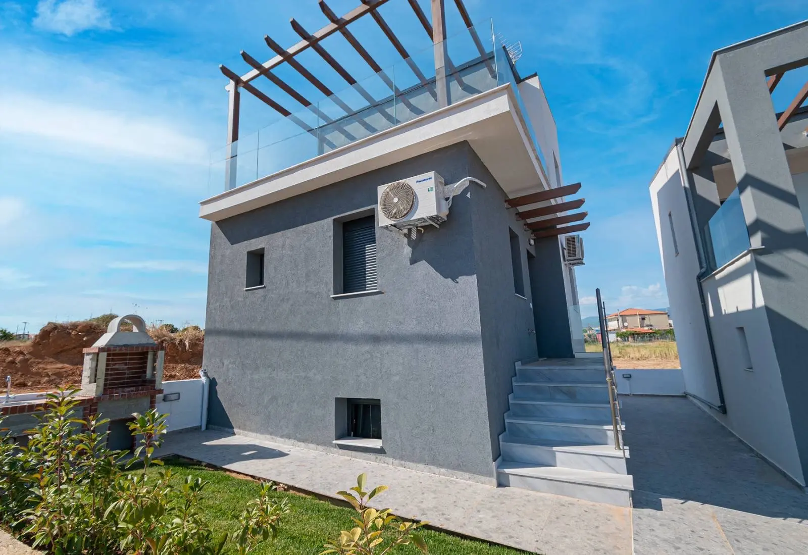 U prizemlju se nalazi svetao dnevni boravak sa kuhinjom otvorenog tipa, spavaća soba i kupatilo sa tušem.Na spratu je još jedna prostrana spavaća soba sa izlazom na veliku terasu sa pergolom, gde je predviđena mogućnost ugradnje jacuzzija i formiranja prijatne zone za odmor, kao i dodatno kupatilo sa tušem.Prilikom gradnje korišćeni su kvalitetni materijali koji obezbeđuju odličnu termoizolaciju. Ugrađeni su savremeni prozori sa komarnicima, solarni bojler za toplu vodu i moderno dizajnirana enterijerska rešenja.Dodatne pogodnosti uključuju podrumski prostor od oko 45 m² za odlaganje i tehničke potrebe, uređeno dvorište, sistem vodosnabdevanja sa rezervoarom i pumpom, kao i video-nadzor, što omogućava udoban boravak tokom cele godine.Ova nekretnina skladno spaja savremenu arhitekturu, blizinu mora i mir jedne od najtraženijih oblasti Halkidikija.